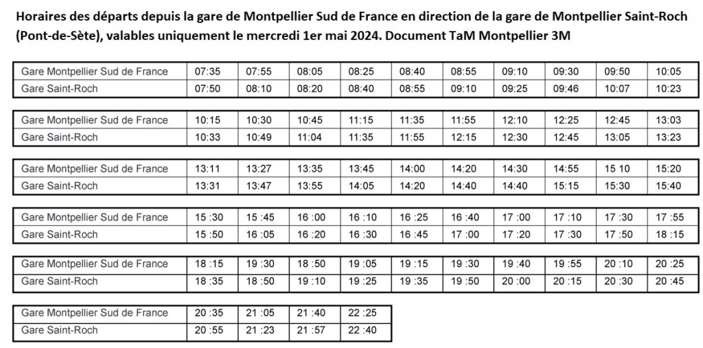 Aucun bus ni aucun tram ne circulera sur le réseau TaM Montpellier 3M mercredi 1er mai 2024, jour de la Fête du Travail, à l’exception de la navette bus « Gare Montpellier Sud de France » qui reliera directement dans les deux sens la gare de Montpellier Saint-Roch, en centre-ville, desservie par des TGV inOui et Ouigo, Intercités et TER, à la gare excentrée montpelliéraine exclusivement desservie par des TGV inOui et Ouigo.