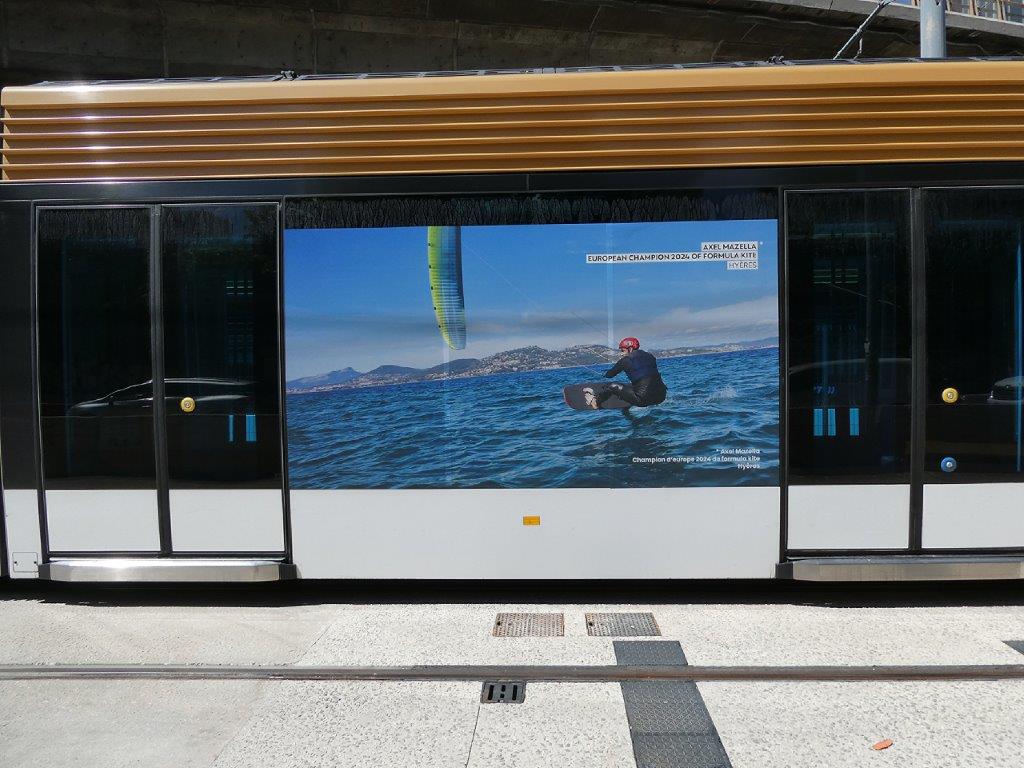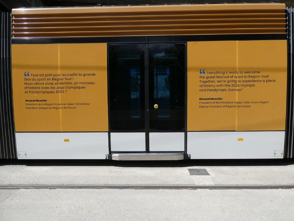 La Métropole Aix-Marseille-Provence, le Département des Bouches-du-Rhône et la Région Sud – Provence-Alpes-Côte d’Azur, se sont associés à la ville de Marseille pour cet événement sportif international majeur, qui se tiendra en France et en Polynésie française du vendredi 26 juillet au dimanche 11 août 2024. A ce titre, la Région Sud – Provence-Alpes-Côte d’Azur a financé un pelliculage spécifique habillant partiellement la rame 013 opérant alternativement sur les lignes T1, T2 et T3 du réseau de tramways de Marseille.