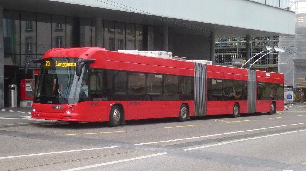 Schanzenstrasse à Berne, le trolleybus 43 BGGT-N2D lighTram 25 DC Hess, opérant sur la ligne 20 en direction du terminus ouest « Länggasse » est photographié au moment où il quitte l’arrêt « Schanzenstrasse » situé à deux pas de la gare principale de la capitale de la Confédération helvétique. Prise de vue en date du dimanche 28 avril 2024. Copyright : Michel Bozzola