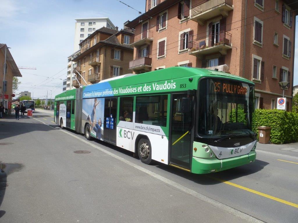 La ligne 9, reliant « Prilly, Eglise » à « Lutry, Corniche » via le centre-ville de Lausanne et la commune de Paudex, est la plus fréquentée du réseau de trolleybus avec près de 19 000 voyages quotidiens. Elle est la seule ligne dont le service est assuré par des trolleybus bi-articulés BGGT-N2D lighTram 25 DC du constructeur suisse HESS, que la Métropole du Grand Nancy, en France, a acheté à 25 exemplaires pour remplacer d’ici le début de l’année 2025 les désastreux TVR Bombardier retirés de la circulation le dimanche 12 mars 2023. Ces trolleybus, tout comme ceux du modèle BGT-N2D lighTram 19 DC, ont la particularité d’utiliser la technologie IMC (In Motion Charging) qui leur permet de rouler en mode 100 % électrique, même lorsqu’ils ne sont plus alimentés par les lignes aériennes de contact. C’est une batterie de faible poids installée sur le toit qui prend le relais. La batterie se recharge lorsque les perches sont levées et captent le courant procuré par les fils électriques. L’autonomie de ces trolleybus dernier cri peut ainsi atteindre 15 à 20 km en mode batterie, ce qui présente l’avantage de pouvoir s’écarter de leur itinéraire habituel sous caténaire double en cas de besoin. Le passage du filaire à la batterie et l’opération inverse s’effectuent en quelques secondes quand le véhicule est à l’arrêt. Bernmobil, l’opérateur du réseau de transport public de Berne, capitale de la Suisse, possède 14 trolleybus bi-articulés BGGT-N2D lighTram 25 DC Hess identiques à ceux opérationnels sur la ligne 9 lausannoise et vient de passer une commande portant sur 13 véhicules supplémentaires du même modèle.