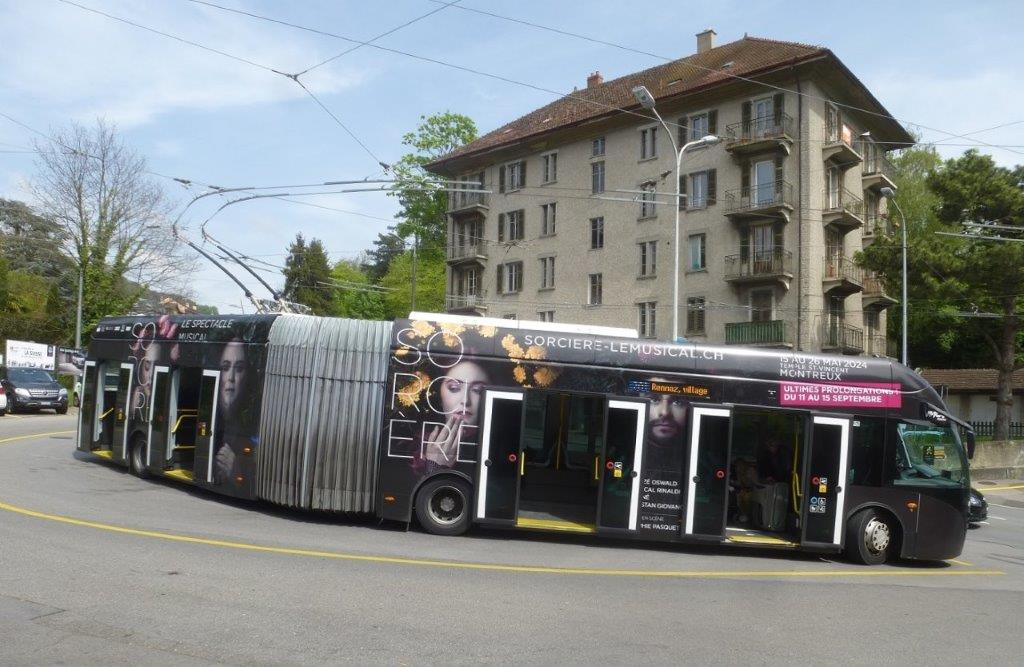 Le trolleybus articulé 815 Exqui.City 18 T Van Hool assure la promotion de la 30e édition du festival international des artistes de rue organisée à Vevey du vendredi 16 au dimanche 18 août 2024. Photo prise à Vevey, tout juste après que le véhicule a quitté le terminus nord-ouest « Vevey, funiculaire » de la ligne 201 en direction du terminus sud-est « Rennaz, village », le lundi 29 avril 2024. Copyright : Michel Bozzola
