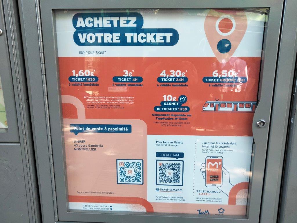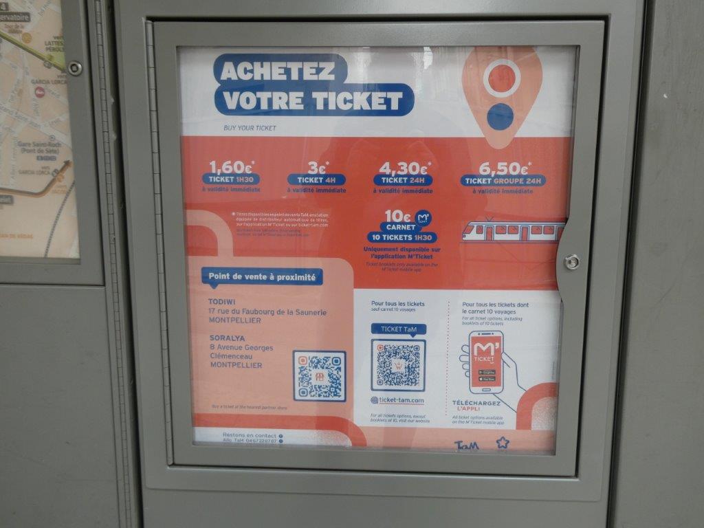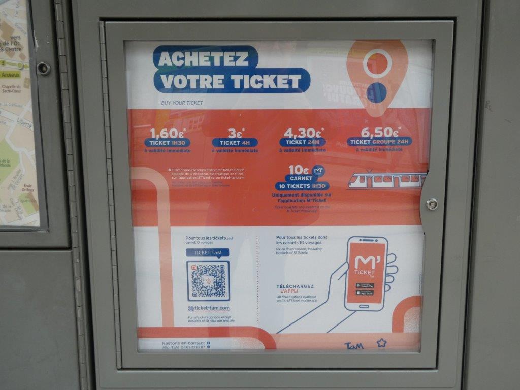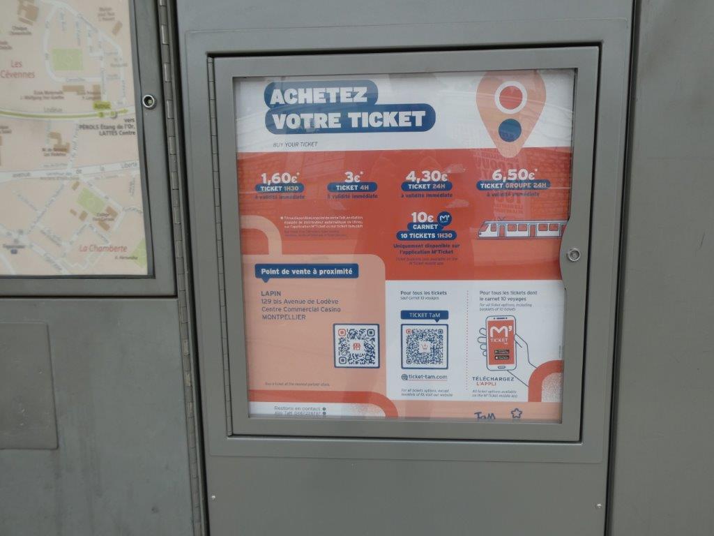 Dans les faits, la nouvelle affiche informative préconise l’utilisation d’un smartphone Android ou iPhone pour flasher un code QR en vue d’acquérir un des tickets à usage immédiat ou pour télécharger l’application M’Ticket TaM, si ce n’est déjà fait, afin de pouvoir se procurer 10 trajets valables une heure trente minutes chacun à partir de leur activation unitaire avant de monter à bord d’un bus ou d’un tramway pour le prix de 10 €. Pour les personnes ne disposant pas d’un smartphone ou ne souhaitant pas s’en servir pour se déplacer sur le réseau TaM Montpellier 3M, l’affiche indique si possible un ou deux points de vente à proximité, mais fait l’impasse sur l’existence d’un distributeur automatique de titres de transport sur le quai d’en face de la station de tramway qui en est encore équipée ou sur la présence d’un distributeur automatique de titres de transport dans une station de tramway située à une distance moins éloignée que le ou les commerçants relais TaM mentionnés.
