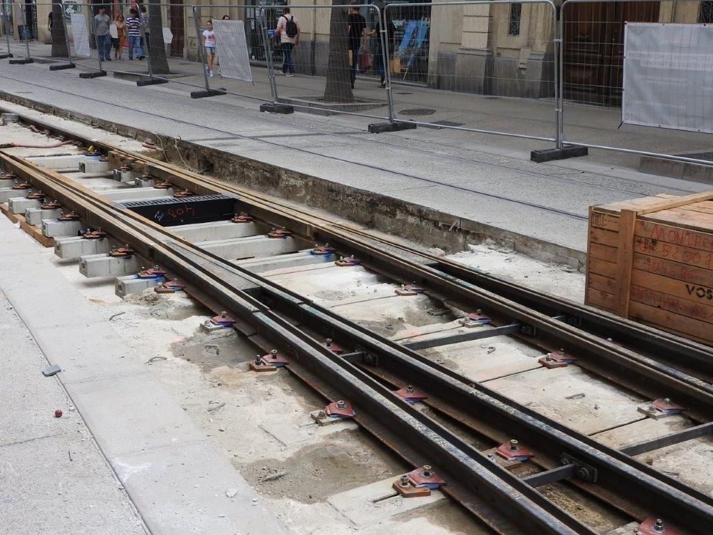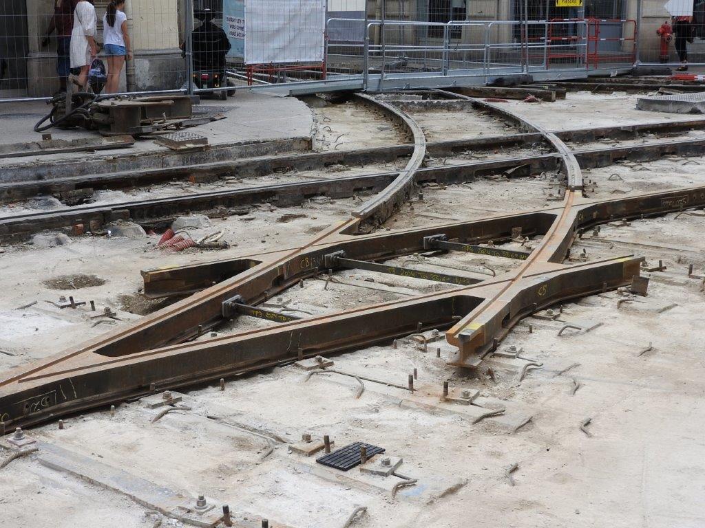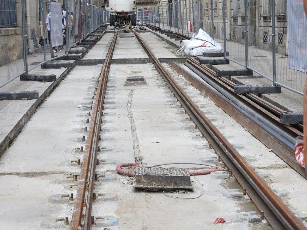 La plupart des rails, appareils de voie et traversées obliques, qui sont en cours de remplacement, ont été posés à l’origine dans le cadre du bouclage de la ligne 4 de tramway devenu effectif le samedi 2 juillet 2016. Il en est de même des revêtements pavés de la plateforme du tramway faisant l’objet d’une reprise entre la place Edouard-Adam et la place Albert 1er. Les rails et appareils de voie les plus âgés, rue André-Michel et au débouché de cette-dernière sur le cours Gambetta, ont été posés à l’occasion de la construction de la ligne 3 inaugurée le vendredi 6 avril 2012, en même temps que la ligne 4 non bouclée.