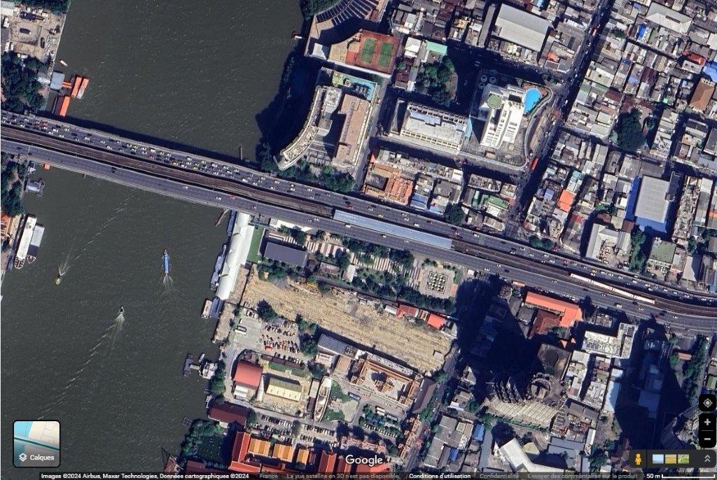A gauche, capture d’écran d’une partie du plan sur lequel figurent le tracé complet de la ligne de métro BTS Skytrain « Silom » reliant dans Bangkok « National Stadium » à « Bang Wa » et l’emplacement de la station « Saphan Taksin ». Document BTS Skytrain – 2024. Copyright : BTS Skytrain. A droite, capture d’écran d’une photo satellite très partielle de Bangkok sur laquelle on aperçoit le pont Taksin, la station « Saphan Taksin » de la ligne de métro BTS Skytrain « Silom » et une rame circulant en direction du terminus ouest « Bang Wa » s’engageant sur la voie unique à double sens desservant la station précitée. Copyright : Google – 2024