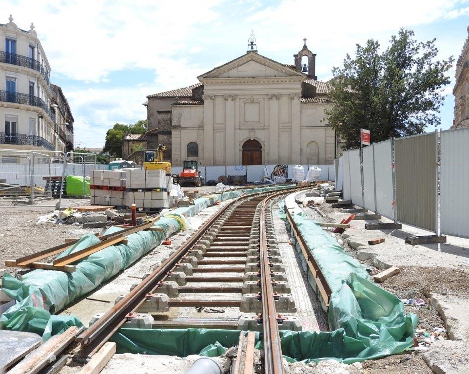 Entamés le samedi 1er juin 2024, les travaux relatifs au raccordement des rails à gorge de la ligne 3 à ceux de la future ligne 5 de tramway se poursuivent jusqu’au dimanche 1er septembre 2024 inclus dans le secteur de la place Saint-Denis à Montpellier.
