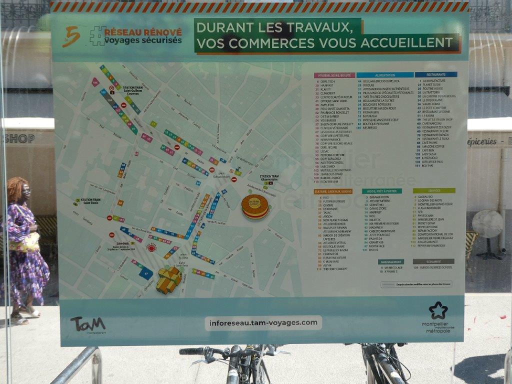 Photographie d’une affiche autocollante listant 113 commerces impactés par des travaux en lien avec la construction de la future ligne 5 de tramway, le remplacement de rails, appareils de voie, traversées obliques et reprise de revêtements de la plateforme des lignes 3 et 4 dans les secteurs Saint-Denis et Jeu-de-Paume à Montpellier. Cette affiche a été appliquée sur une paroi vitrée de la station « Saint-Denis » de la ligne 3, quai directions « Pérols – Etang de l’Or » et « Lattes Centre », faisant office de terminus sud du tronçon nord-ouest de la ligne 3 du lundi 3 juin 2024 au dimanche 28 juillet 2024 inclus. Cette station ne sera pas desservie par les rames de la ligne 3 du lundi 29 juillet au dimanche 1er septembre 2024 inclus. Prise de vue en date du lundi 22 juillet 2024. Copyright : Edouard Paris