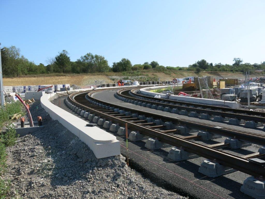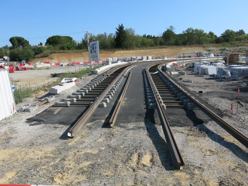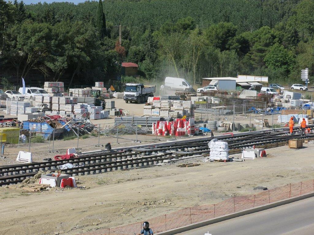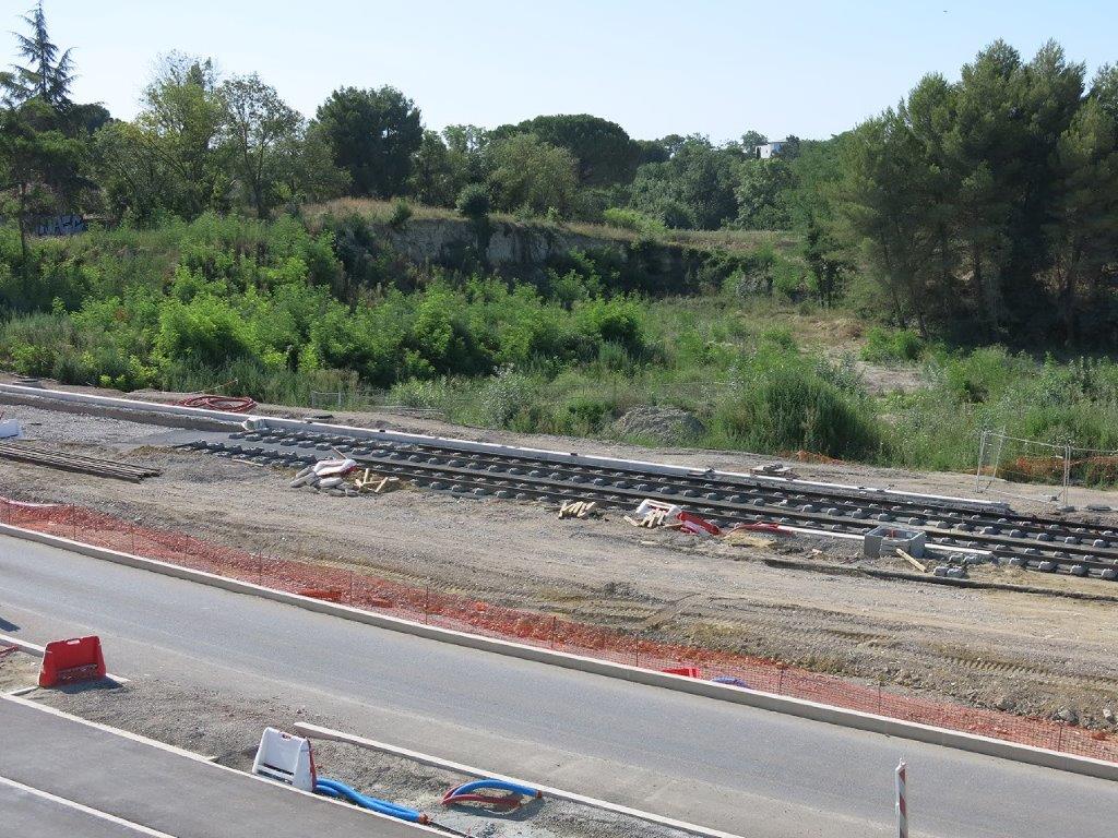 Au vu de deux des sept photos illustrant la présente info, on peut d’ores et déjà affirmer que la future ligne 5 de tramway ne sera pas prolongée jusqu’à Lavérune, du moins à court ou à moyen terme, compte tenu du fait qu’après l’emplacement des futurs quais du terminus ouest et de la communication croisée, les deux voies ferrées en tiroir de l’arrière-station ne restent pas orientées en direction de Lavérune mais effectuent un virage à gauche vers nulle part.