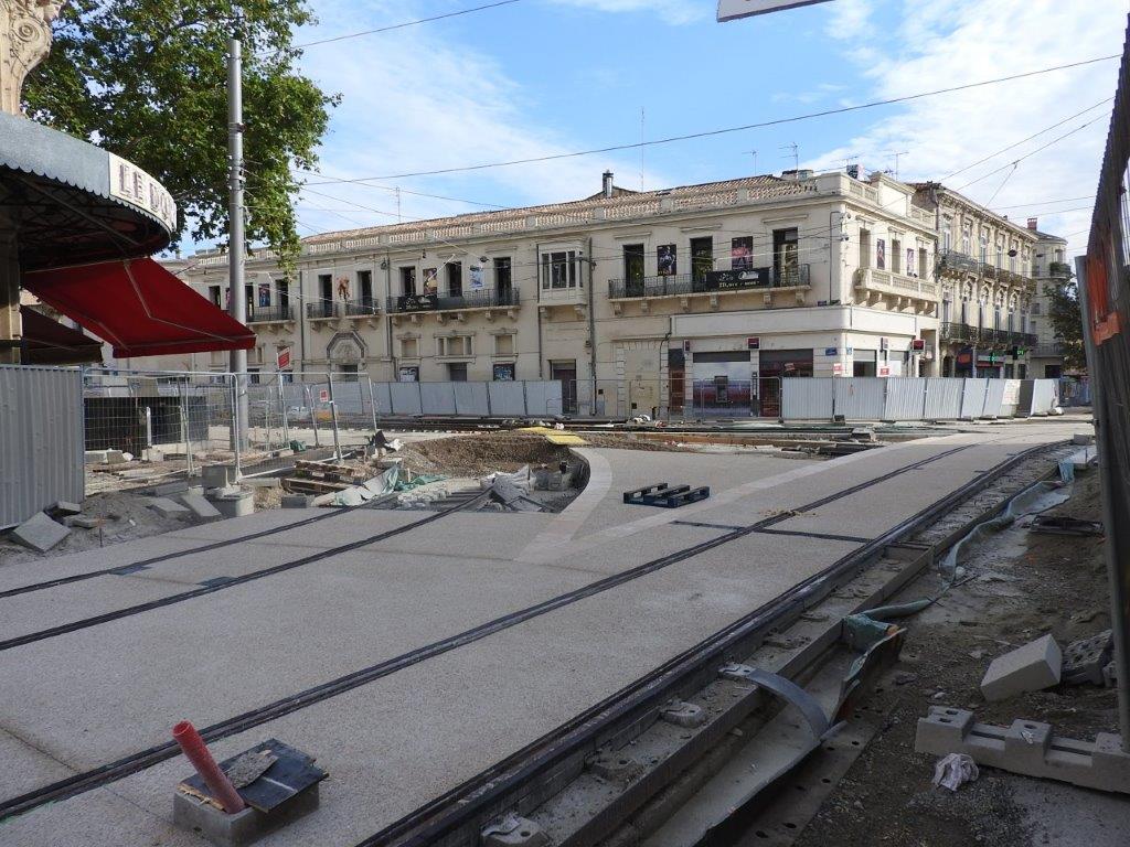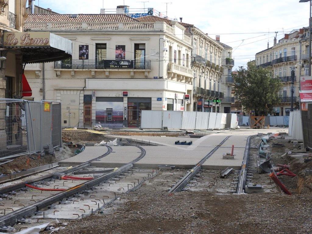 Dans le bas du cours Gambetta à Montpellier, l’aiguillage, qui doit permettre aux rames de la future ligne 5 de tramway de gagner l’avenue Georges-Clemenceau, n’a pas été installé, ainsi que tout un chacun peut le constater sur la présente photo prise le vendredi matin 16 août 2024. Copyright : Anje34
