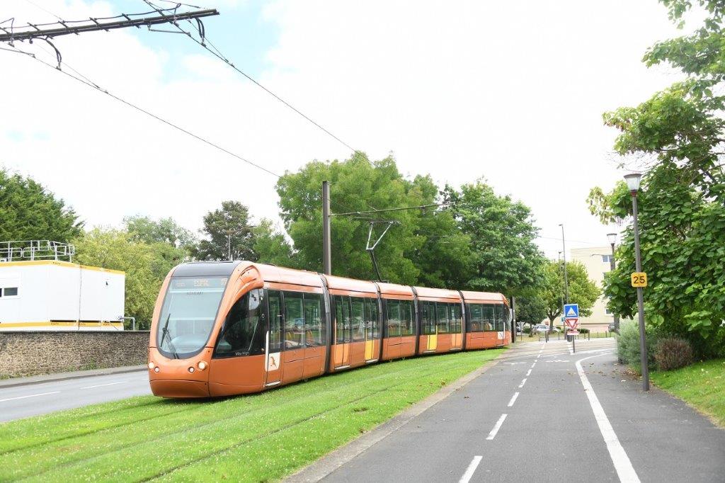 Rue de l’Estérel au Mans, la rame 1016 Citadis 302 Alstom (année 2007), opérant sur la ligne T2, est photographiée à l’approche du terminus « Espal – Arche de la Nature », le mardi 6 août 2024. Copyright : Thierry Leleu