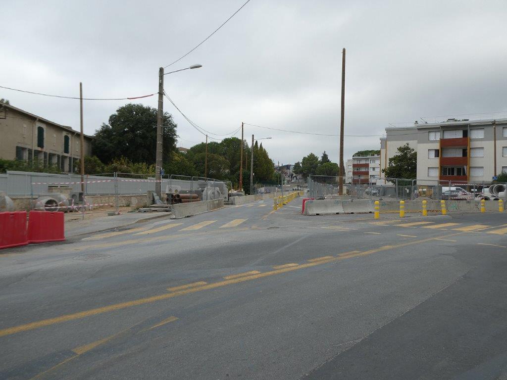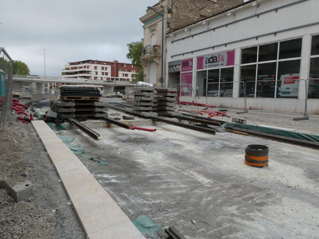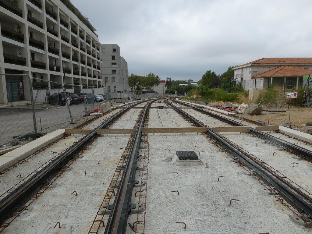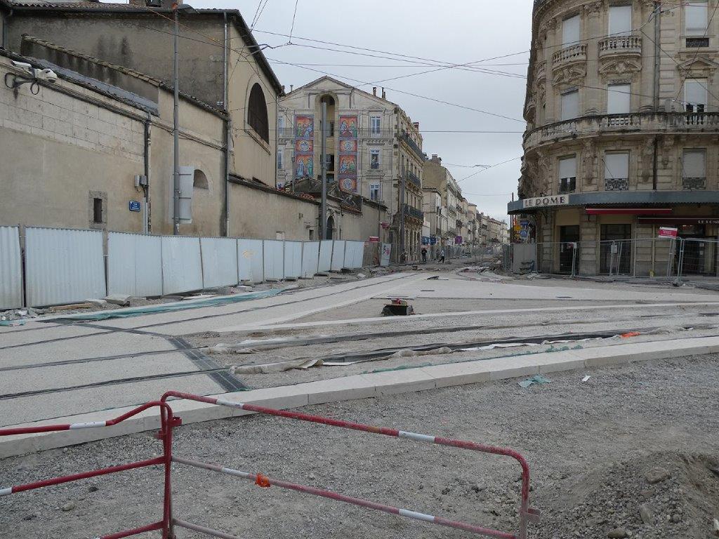 La pose des rails n’a pas progressé sur la place du 8-Mai-1945 depuis un certain temps et n’a toujours pas débuté sur l’avenue Lepic, dans la rue des Chasseurs, dans sa partie située entre l’entrée principale du parc Montcalm et la route de Lavérune, sur la route de Lavérune, dans sa partie située entre la rue des Chasseurs et la rue du Pas-du-Loup, dans la rue du Pas-du-Loup, dans sa partie située entre la rue de Lavérune et le boulevard Paul-Valéry, sur le boulevard Paul-Valéry, dans sa partie située entre la rue du Pas-du-Loup et le centre commercial Ovalie.