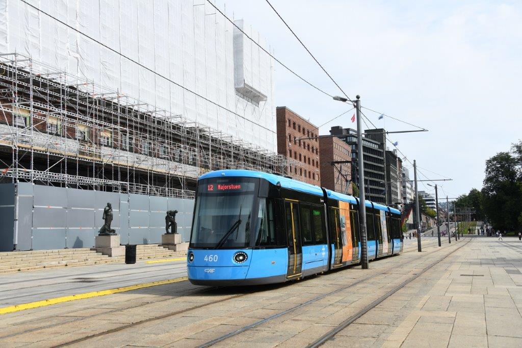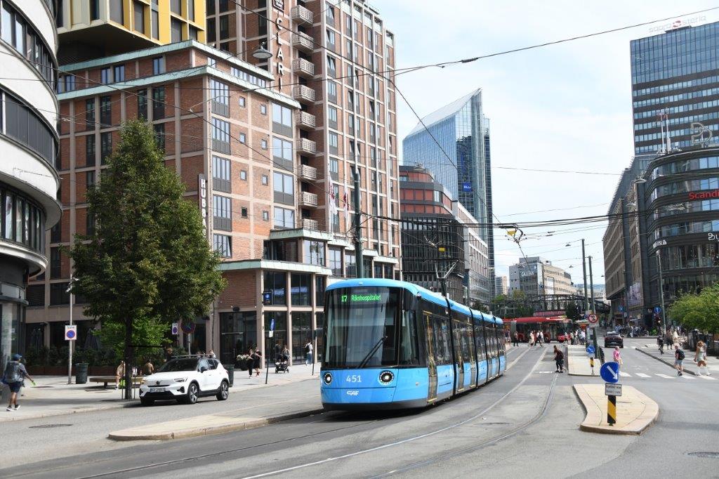 C. J. Hambros plass à Oslo, la rame 420 SL-18 Urbos 100 CAF (année 2023), opérant sur la ligne 17 en direction du terminus nord-est « Sinsen – Grefsen stasjon », est photographiée sur le tronc commun des lignes 17, 18 et 19 à l’approche de la station « Tinghuset », le samedi 3 août 2024. Copyright : Thierry Leleu