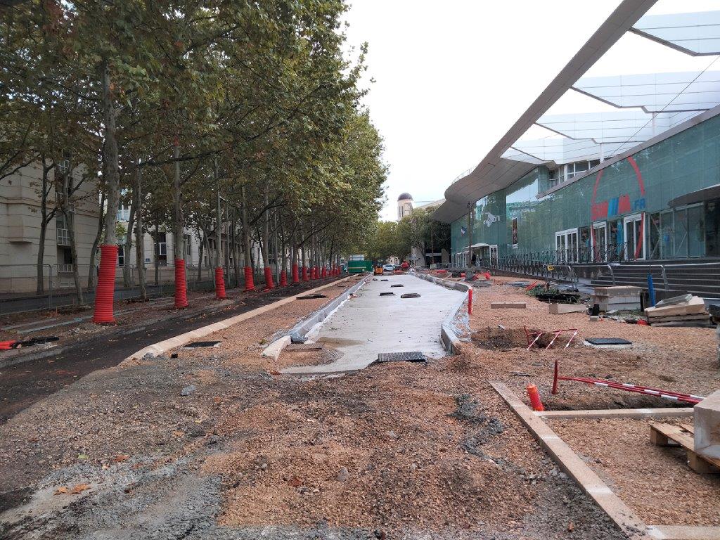 Photographie d’une partie de l’avenue Jacques-Cartier à Montpellier en pleins travaux, où sera implanté le terminus sud-ouest « Place de l’Europe » de la ligne B1 de BusTram. Prise de vue en date du dimanche 8 septembre 2024. Copyright : Edouard Paris