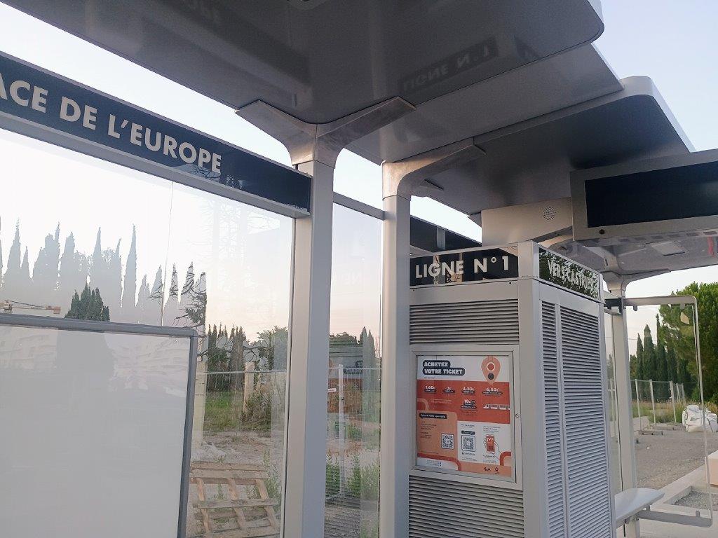 Petit aperçu d’un station de démonstration de la future ligne B1 de BusTram, chemin des Cauquilloux à Castelnau-le-Lez, le lundi 26 août 2024. Copyright : Matwi.