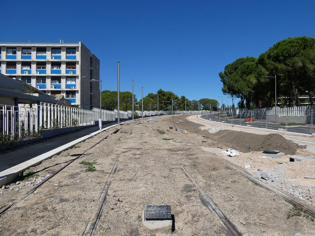 Route de Mende à Montpellier, dans sa portion située entre le rond-point de l’avenue du Vert-Bois et le chemin du Réservoir-de-Montmaur, la pose des voies ferrées de la future ligne 5 de tramway n’a pas encore dépassé les portails de sortie et d’entrée du CNRS, ainsi que le montre la photo prise le dimanche 15 septembre 2024. Copyright : Edouard Paris