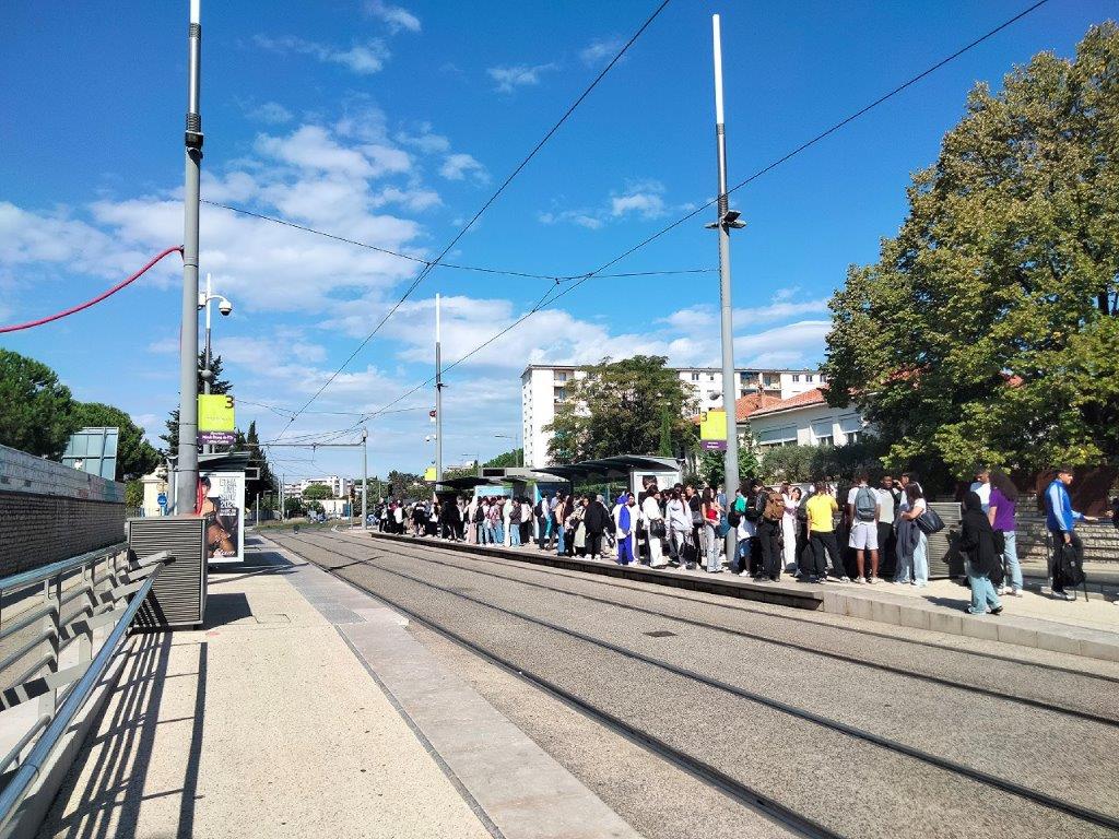Du fait de la gratuité des transports, de très nombreux lycéens du lycée polyvalent Jules Guesde à Montpellier délaissent les longues marches à pied. Photo prise à la station « Jules Guesde » de la ligne 3, avenue de Lodève, le lundi 23 septembre 2024 à 12h10. La plupart d’entre eux descendront à la station suivante « Tonnelles » qui dessert l’hypermarché Auchan. Copyright : Edouard Paris