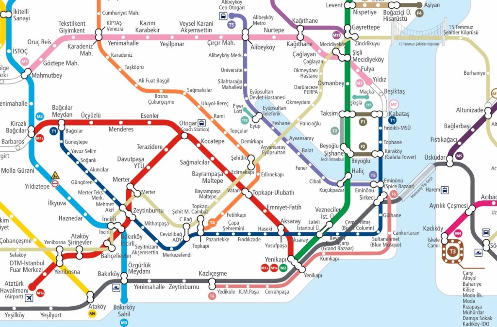 Plan partiel sur lequel figure la totalité des itinéraires des lignes T1 (tramway moderne), T2 (tramway historique), T3 (tramway historique), T4 (métro léger), T5 (tramway moderne APS) et T6 (en réalité une ligne ferroviaire totalement rénovée et rouverte le lundi 26 février 2024). Copyright : Metro İstanbul 2024. v.3 rev.18.1 (septembre 2024)