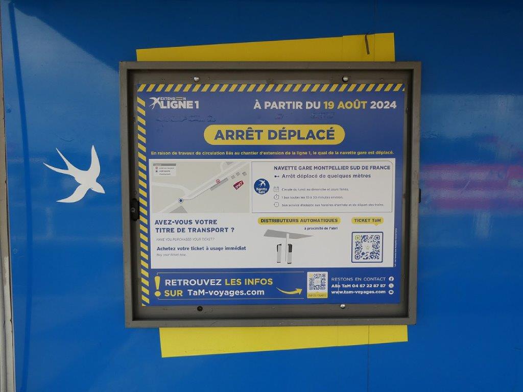 Pour rappel, le ticket vendu par les automates de l’arrêt « Gare Montpellier Sud de France » ne concerne que les voyageurs qui ne sont pas titulaires d’un Pass gratuité. Pour acquérir un tout autre ticket à usage immédiat valable 4 heures, 24 heures (individuel ou groupe), 48 heures, 72 heures, 96 heures ou 7 jours à partir de son achat, il faut flasher un QR Code que l’on trouve sur une affiche informative apposée dans un cadre fixé à une paroi de l’abri de l’arrêt précité ou bien utiliser l’application M’Ticket TaM sur son smartphone Android ou iPhone, qui propose en plus 10 voyages pour 10 € , chacun d’eux valables 1 h 30 à partir du moment où on procède à son activation avant de monter à bord d’un bus ou d’un tramway.