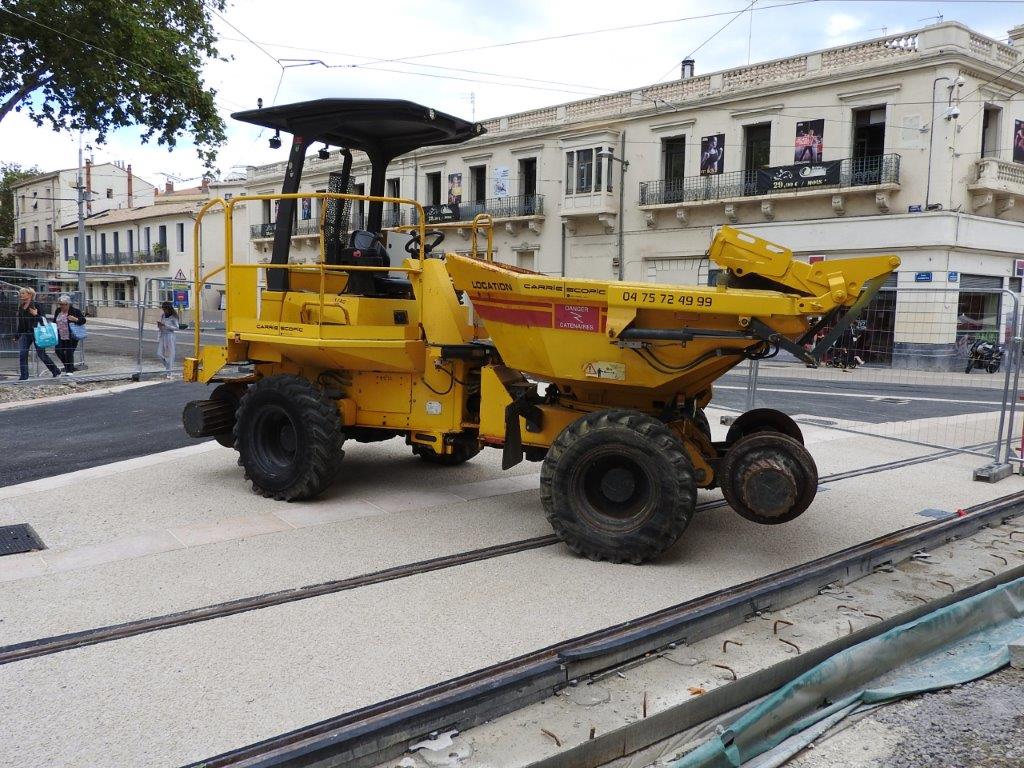 Un engin de chantier rail-route est photographié à l’intersection de l’avenue Georges-Clemenceau du cours Gambetta et de la place Saint-Denis à Montpellier, le vendredi 27 septembre 2024. Copyright : Anje34