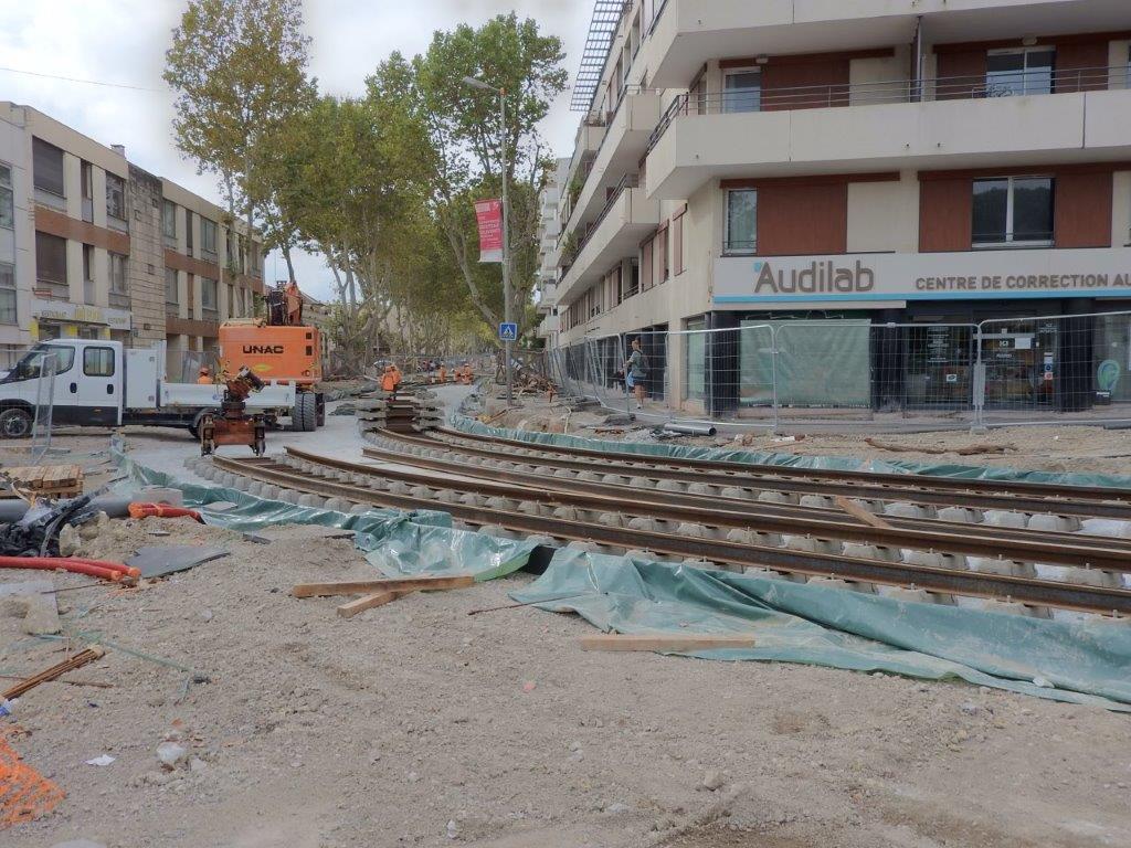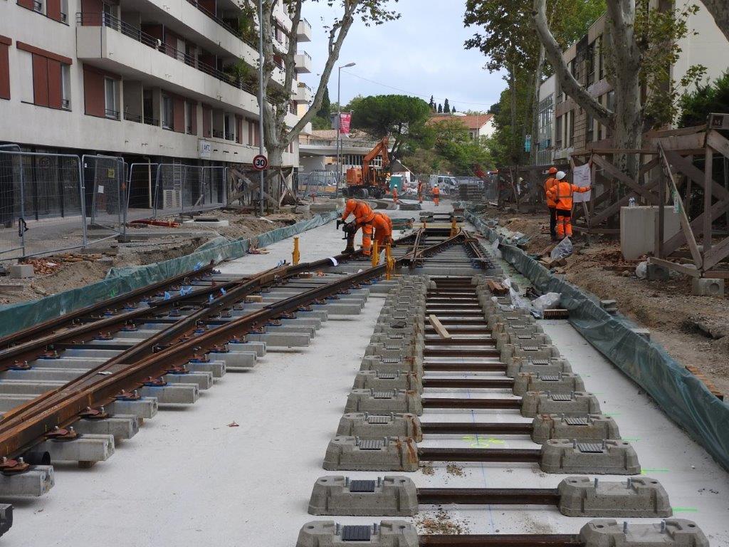 Avenue Lepic à Montpellier, installation d’une communication simple devant permettre aux rames de la future ligne 5 de tramway de changer de voie si nécessaire. Photo prise le mardi 1er octobre 2024. Copyright : Anje34