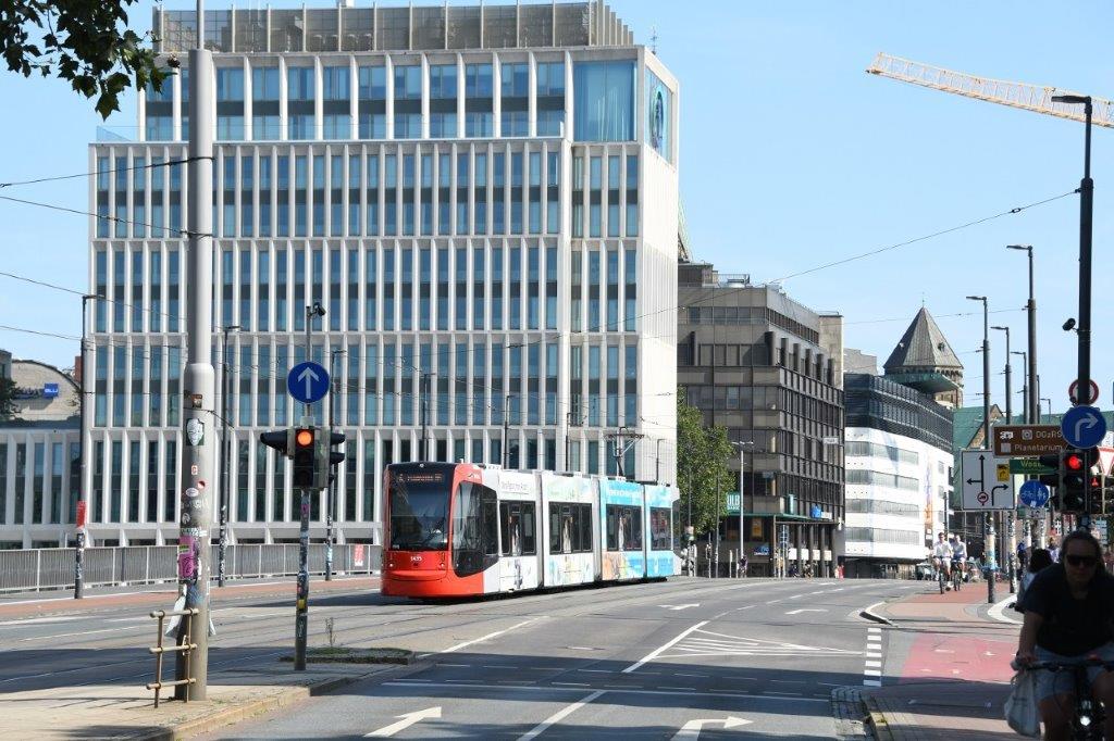 Am Dom, dans le centre historique de Brême, la motrice articulée 557 GT4f Wegmann (année 1977) et sa remorque articulée 747 GB4f Wegmann (année 1977), opérant sur la ligne 15 « Stadtrundfahrt » (tour de ville), sont photographiées sur le tronc commun des lignes 2 et 3 entre les stations « Obernstraße » et « Domsheide », le dimanche 1er septembre 2024. Copyright : Thierry Leleu