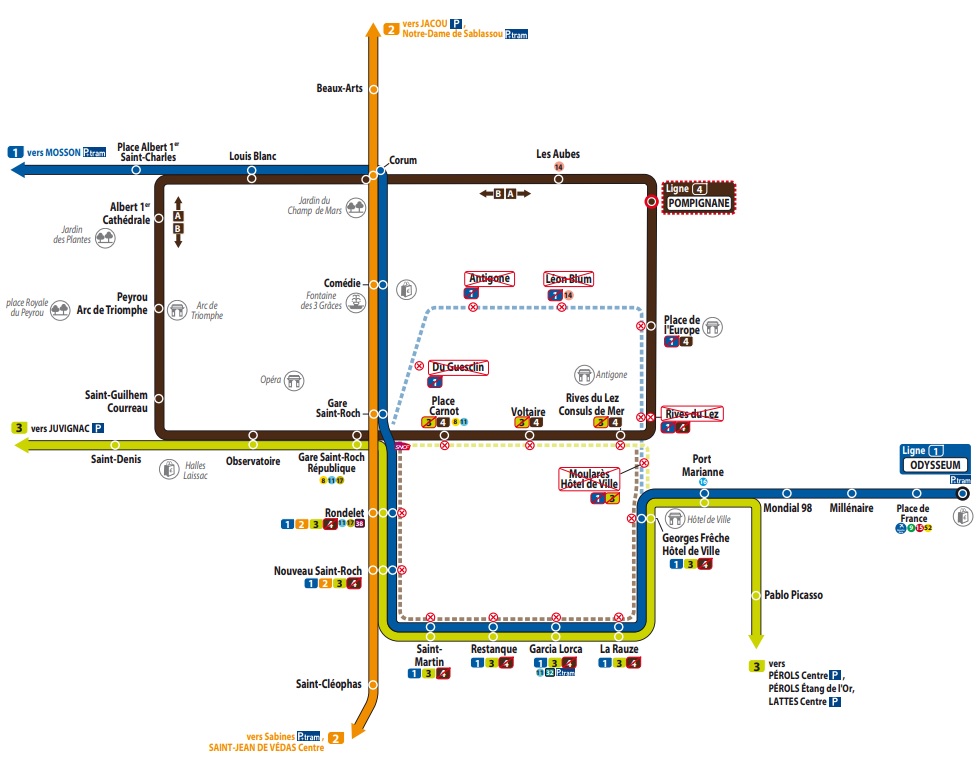 Entre la place Auguste-Gibert, carrefour stratégiques des quatre lignes du réseau de tramways de Montpellier situé devant la façade néo-classique et ses colonnades grecques de la gare de Montpellier Saint-Roch, et la station « Port Marianne » (L1 et L3), les rames opérant sur les lignes 1 et 3 emprunteront dans les deux sens une partie de l’itinéraire de la ligne 4 et desserviront les stations suivantes : « Rondelet », « Nouveau Saint-Roch », « Saint-Martin », « Restanque », « Garcia Lorca », « La Rauze » et « Georges Frêche – Hôtel de Ville ».