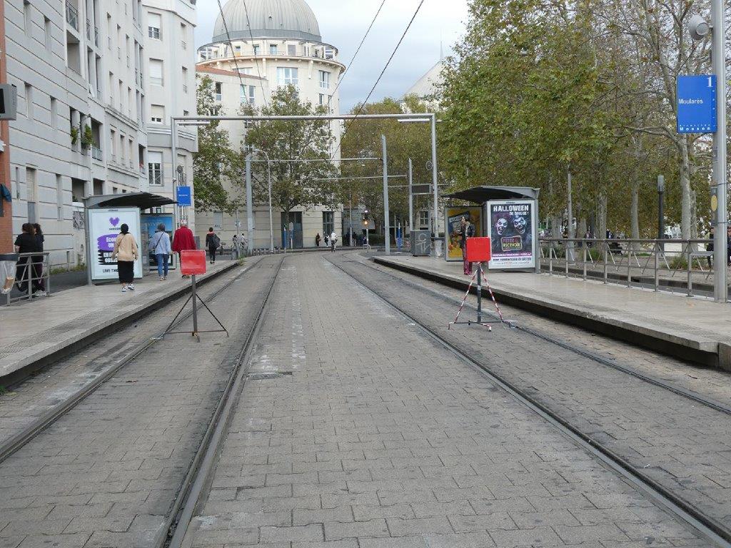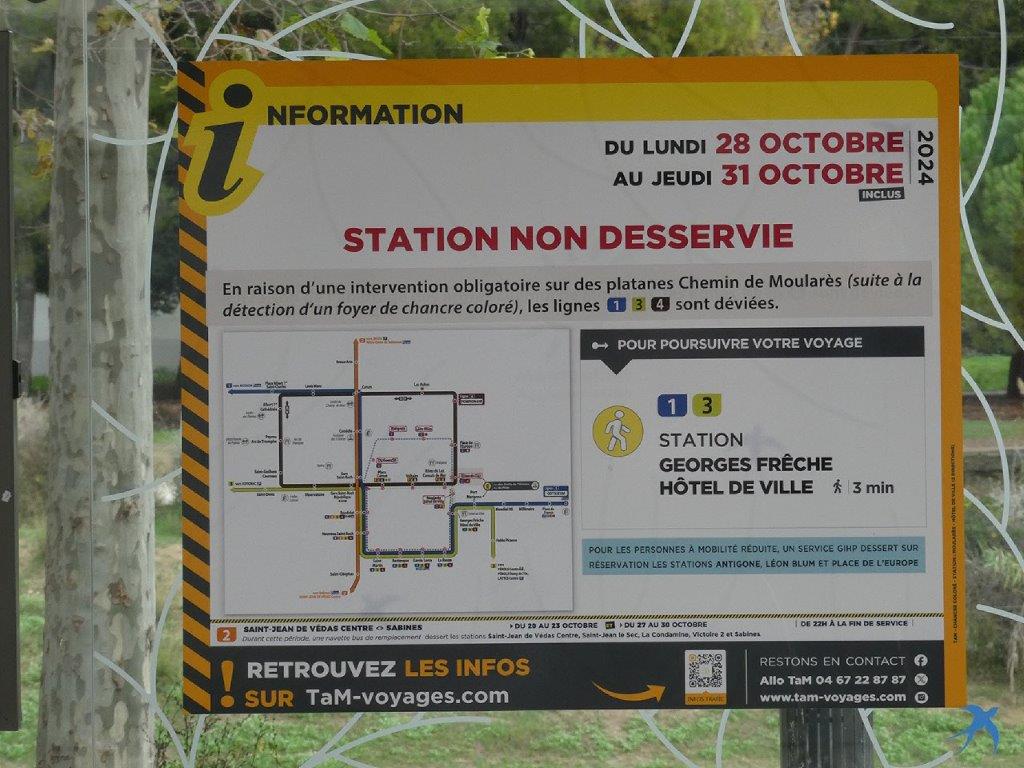 Chemin de Moularès à Montpellier, sur le tronc commun des lignes 1, 3 et 4 de tramway, l’abattage et le dessouchage de plusieurs platanes atteints du chancre coloré entraînent des modifications des itinéraires des lignes précitées du lundi 28 octobre au jeudi 31 octobre 2024.
