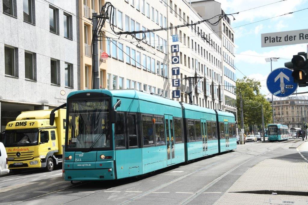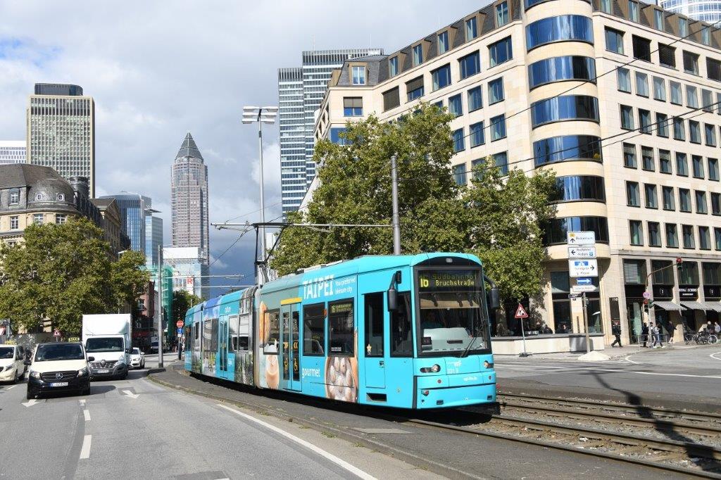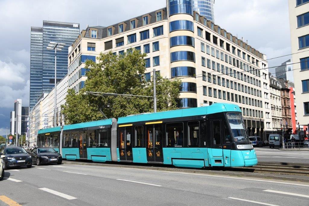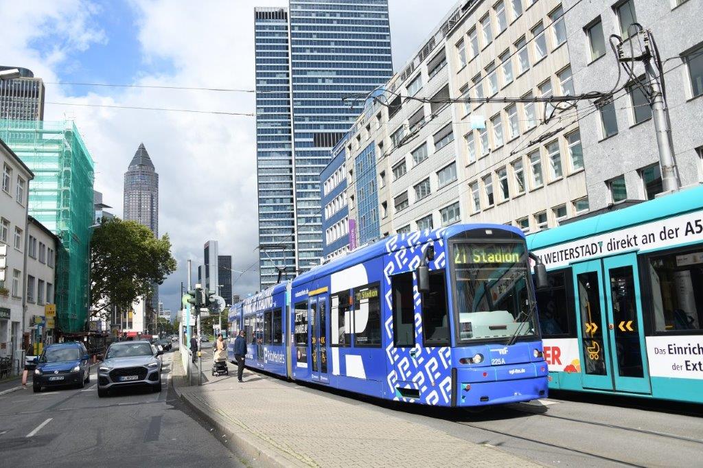 Düsseldorfer Straße à Francfort-sur-le-Main, la rame 303 de type T30 Citadis X05 Alstom (année 2023), opérant sur la ligne 21 en direction du terminus intermédiaire « Niederrad Oberforsthaus », est photographiée sur le tronc commun des lignes 11, 14, 16, 17 et 21 entre les stations « Platz der Republik » et « Hauptbahnhof », le jeudi 12 septembre 2024. Copyright : Thierry Leleu