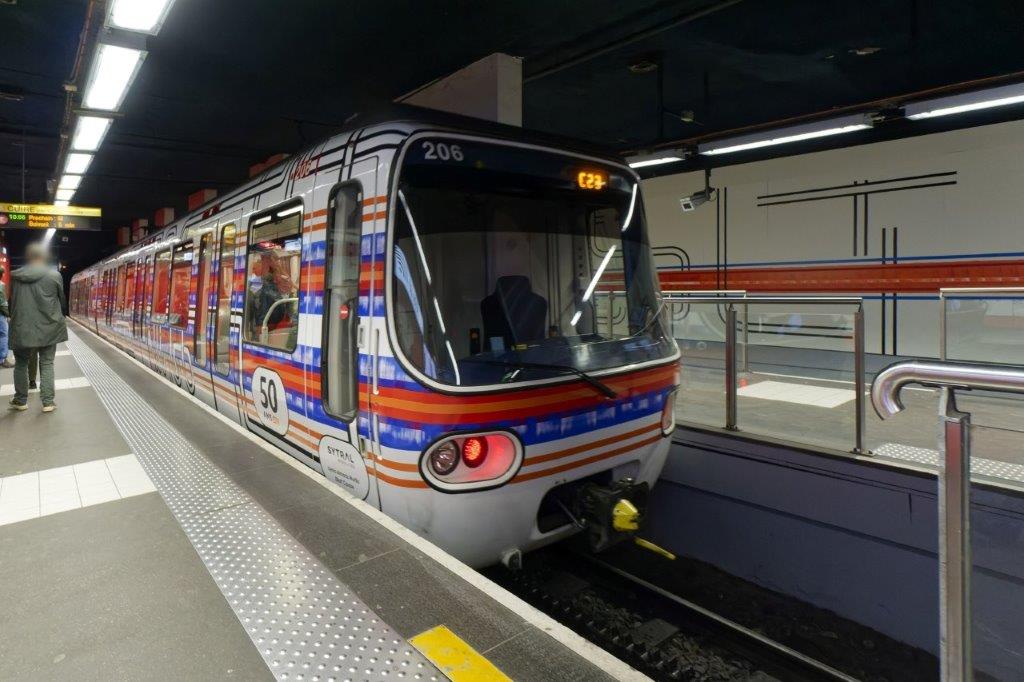 A l’occasion du 50e anniversaire de la ligne C, célébré le lundi 2 décembre 2024 sur un quai de la station terminus « Hôtel de Ville Louis Pradel », en présence de Bruno Bernard, président de la Métropole de Lyon et de SYTRAL Mobilités, une œuvre picturale de plus de 40 m de long, intitulée « Circuits entrelacés », réalisée par un duo d’artistes, Kenia Almaraz Murillo et Elliott Causse, a été dévoilée sur un mur de la station précitée. La Bolivienne et le Francilien ont uni leurs inspirations pour présenter une fresque hommage à l’histoire du tissage sur la colline de la Croix-Rousse, mais également clin d’œil à son métro et aux mouvements. De même, à l’instar des livrées artistiques qui décorent intégralement un trolleybus et dix rames de tramway du réseau TCL, le duo d’artistes est également à l’origine de l’habillage de la rame 205/206 opérant sur la ligne C, en écho à la fresque présentée à la station terminus « Hôtel de Ville ». Cette rame arborera cette livrée très originale jusqu’au 51e anniversaire de la ligne C.