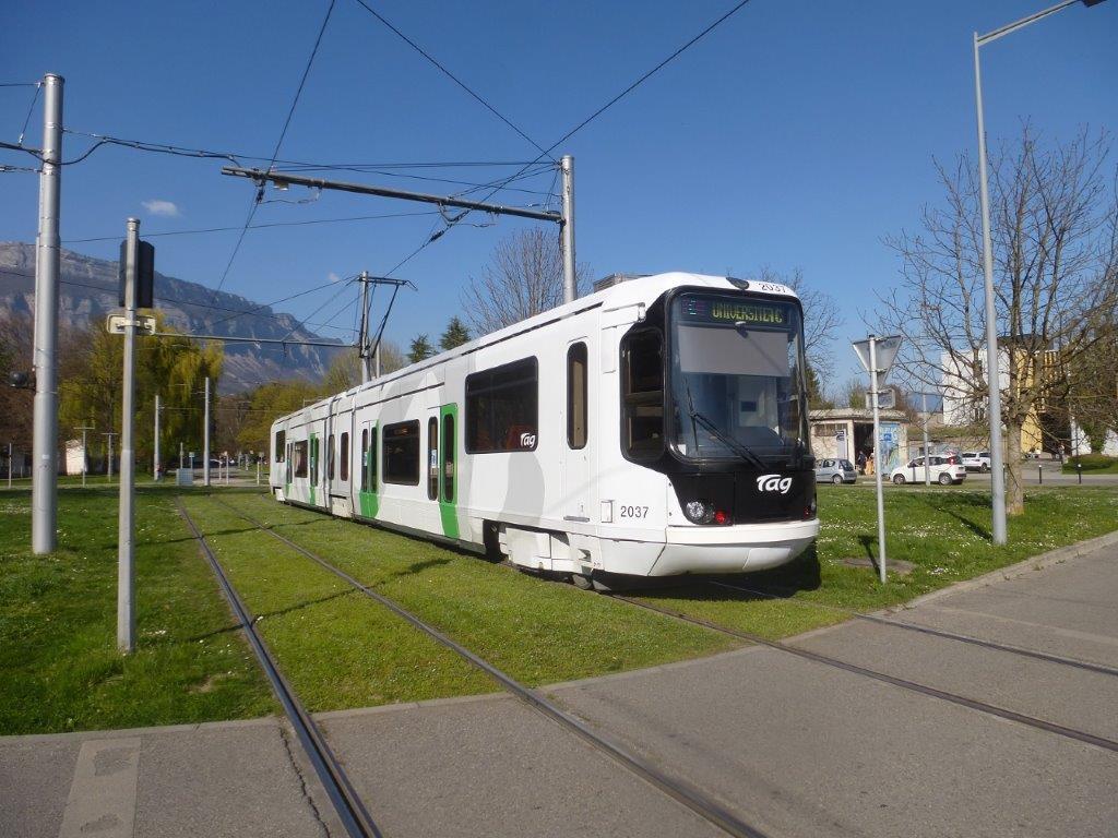 Rue de la Houille-Blanche à Saint-Martin-d’Hères, la rame rénovée 2037 TFS GEC-Alsthom/De Dietrich, opérant sur la ligne C en direction du terminus « Université Condillac », est photographiée tout juste après avoir quitté la station « Hector Berlioz – Universités » commune aux lignes C et D, le jeudi 24 mars 2022. Depuis le samedi 24 août 2024, la station « Hector Berlioz – Universités » a pris le nom de « Université – Les Taillées », quais communs aux ligne C et D, et depuis le lundi 2 septembre 2024, le logo TaG a été remplacé par le logo M réso. Copyright : Michel Bozzola