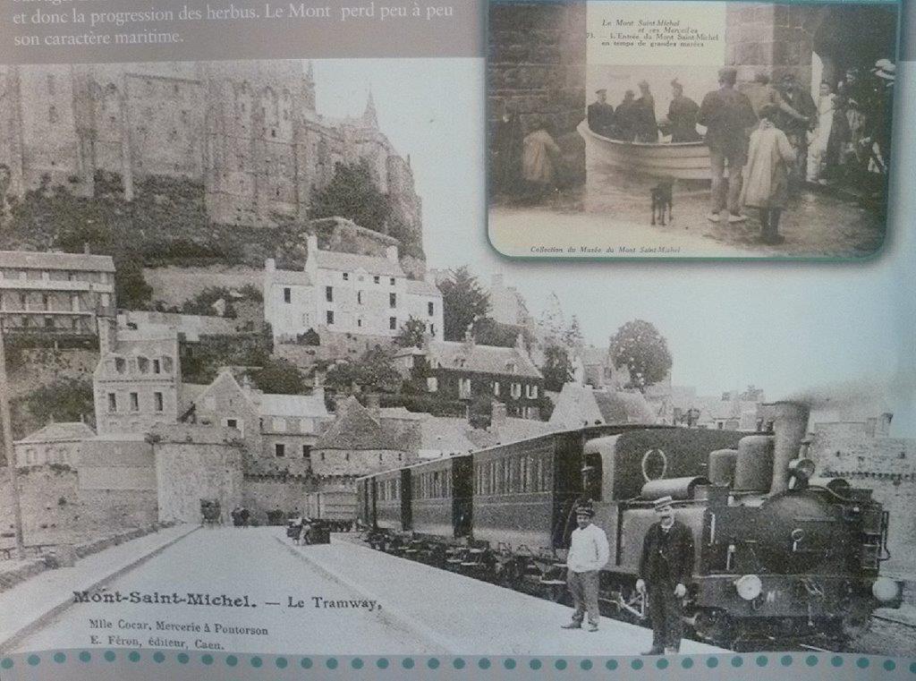Photographie d’une carte postale agrandie exposée dans l’abbaye du Mont-Saint-Michel, montrant un train stationnant au pied des remparts du Mont-Saint-Michel vers 1910. Prise de vue en date du mardi 22 avril 2014. Copyright : Edouard Paris