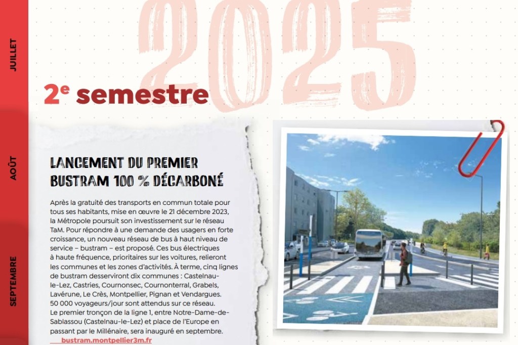 Info intitulée « Lancement du premier BusTram 100 % décarboné » consultable en page 14 du magazine institutionnel « Montpellier Métropole en commun # 32 — JANVIER-FÉVRIER 2025 ». Document Montpellier Méditerranée Métropole