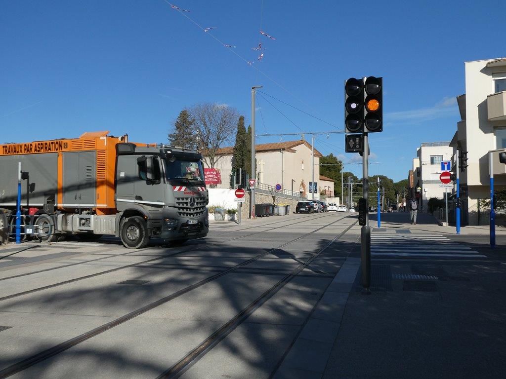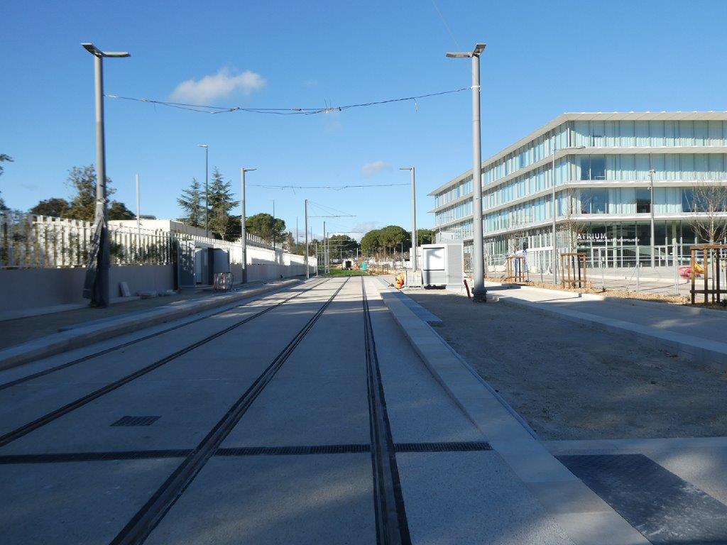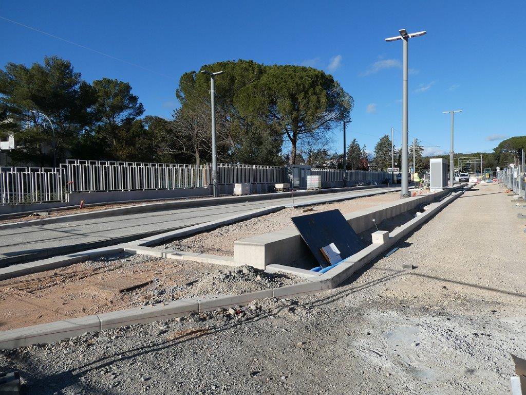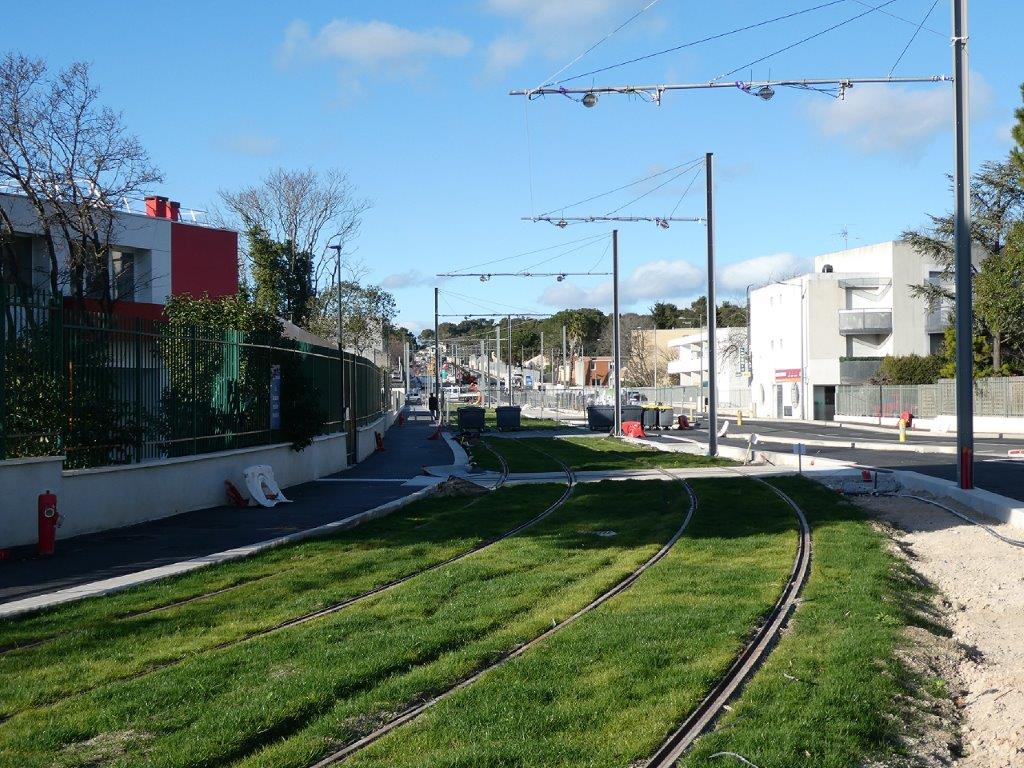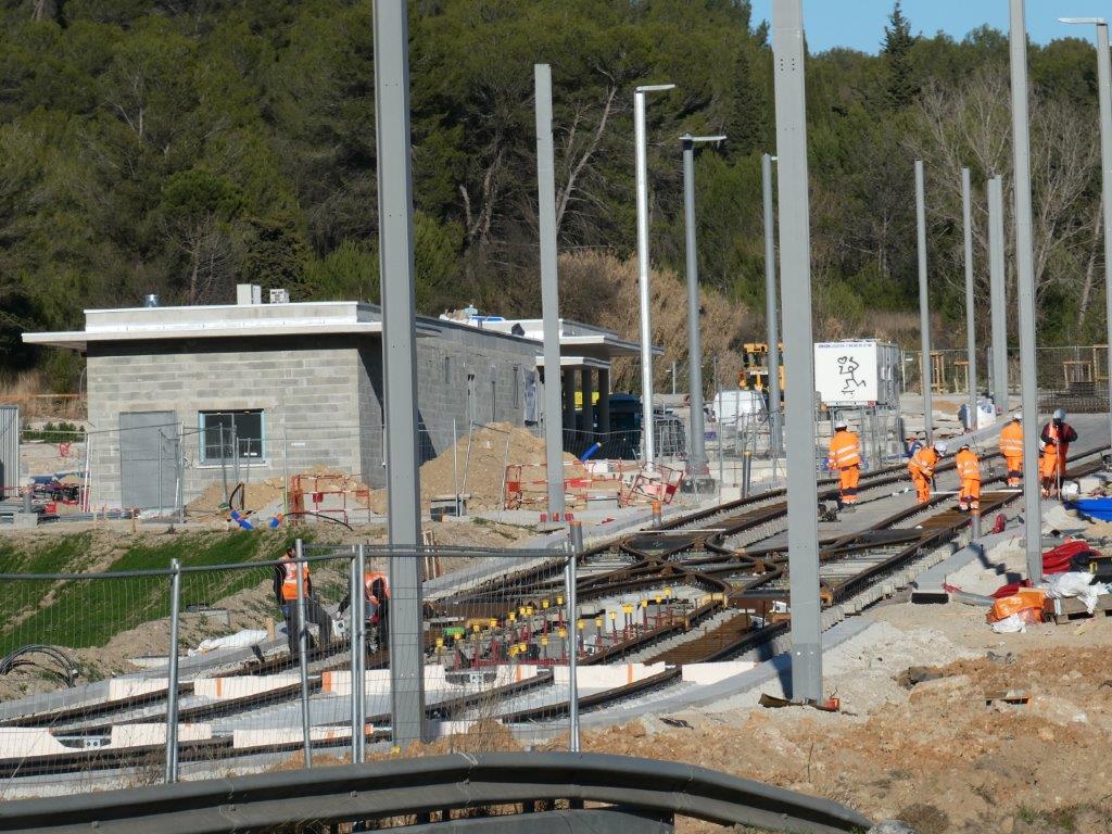 Le mardi 7 janvier 2025, il manquait une soixantaine de mètres de double voie ferrée à poser entre la base de travaux de la route de Mende et l’intersection avec la rue de l’Hortus, à proximité de la station « Plan des 4 Seigneurs » en cours de construction, cent cinquante mètres environ de double voie ferrée à poser en grande partie sur le nouveau pont enjambant la Lironde aux limites des communes de Montpellier et de Montferrier-sur-Lez, et trois cent cinquante mètres environ de double voie ferrée à poser entre la station « Montferrier-sur-Lez » en construction et le nouveau pont sur le Lez.