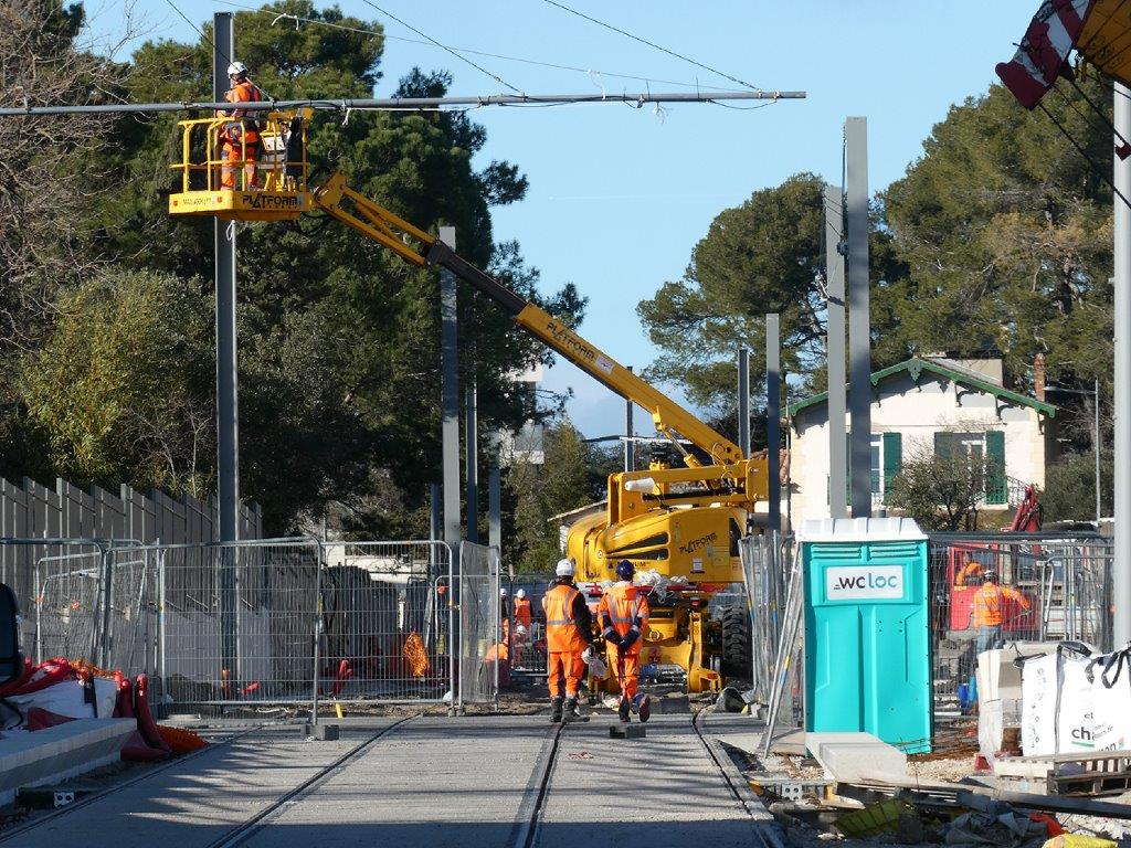 Outre la mise en place de mobilier de station, il y a lieu de signaler le début du déroulage d’une des deux lignes aériennes de contact, une au-dessus de chaque voie ferrée, sur le tronçon nord de la future ligne 5 de tramway. Pour ce faire, les mâts sont équipés d’un isolateur, de trois haubans, d’une console et de deux bras soutenant chacun la ligne aérienne de contact. Les mâts érigés en station, qui se font face, son équipés d’une suspension et non pas d’une console.