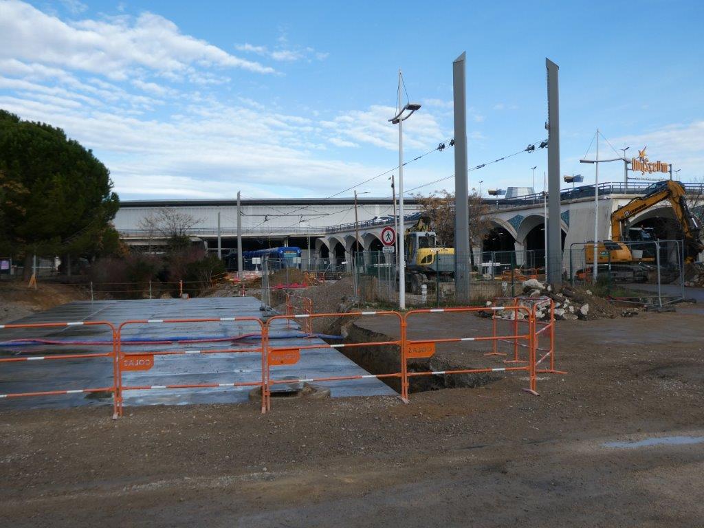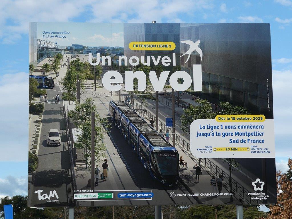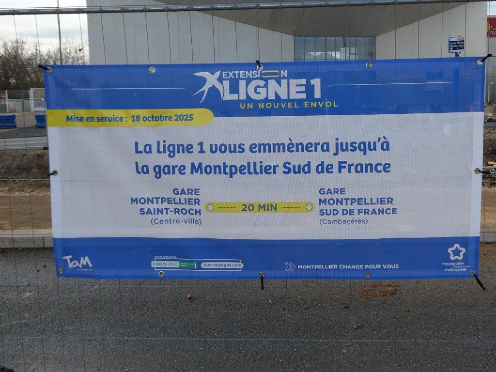 Le totem a été installé le samedi 21 décembre 2024, à 300 jours de l’ouverture du prolongement de 1,3 km qui ne comprendra qu’une seule station, en l’occurrence le futur terminus « Gare Sud de France » implanté en bordure de la place Françoise-Héritier. Ce nouveau terminus va être inopportunément doté d’une arrière-station nécessitant la mise en place d’une courbe à faible rayon à double voie. Cette arrière-station sera équipée d’une communication croisée et de deux voies en tiroir, le tout posé dans la rue Jacques-Derrida. L’extrémité des deux voies en tiroir se trouvera à 200 mètres environ de la station terminus afin que les rames de tramway ne stationnent pas devant la façade sud-est de la Halle de l’innovation. La création de l’arrière-station, comprise dans les 1 300 mètres du prolongement à double voie, entraînera le rétrécissement partiel de la rue Jacques-Derrida et sa mise à sens unique pour les véhicules automobiles.