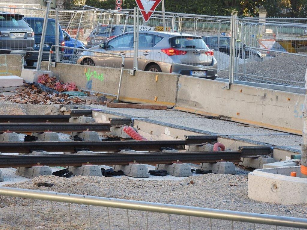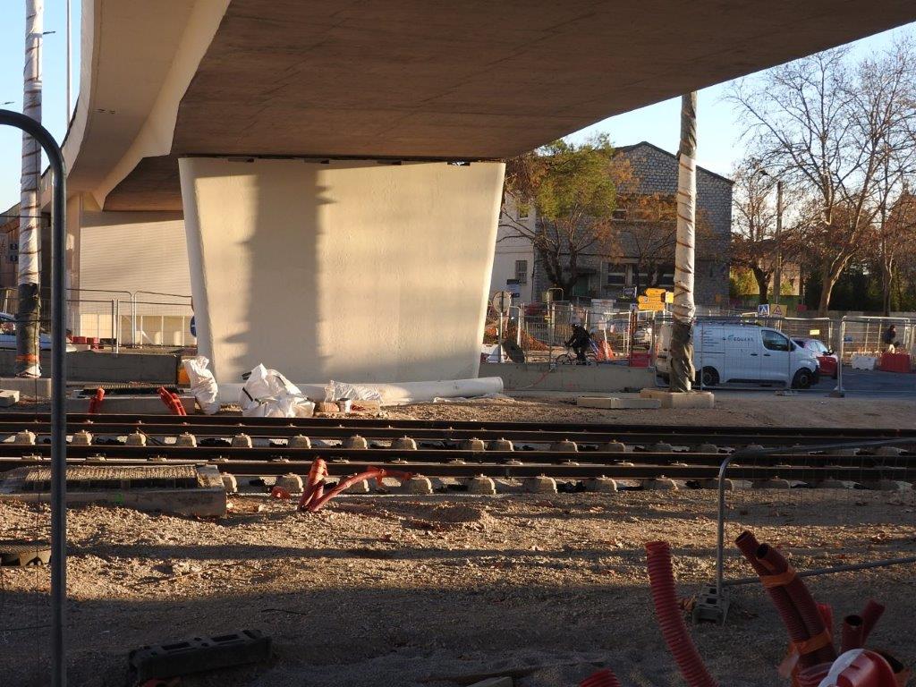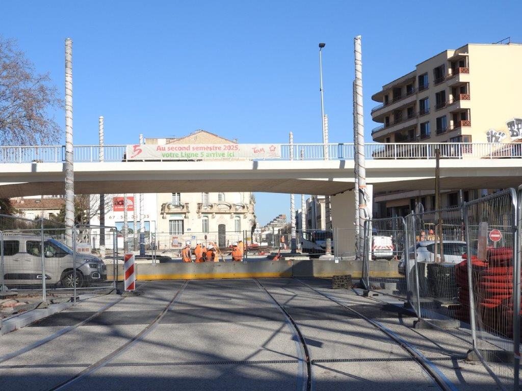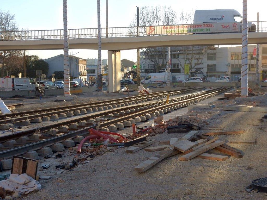 Les mardi 14 et mercredi 15 janvier 2025, des rails à gorge rectilignes ont été posés sur des traverses bibloc en béton entre la double voie ferrée débouchant sur la place du 8-Mai-1945 depuis l’avenue Georges-Clemenceau à l’est et la double voie ferrée venant de l’avenue Lepic à l’ouest et traversant la chaussée où circulent les véhicules automobiles arrivant de la rue de Claret.