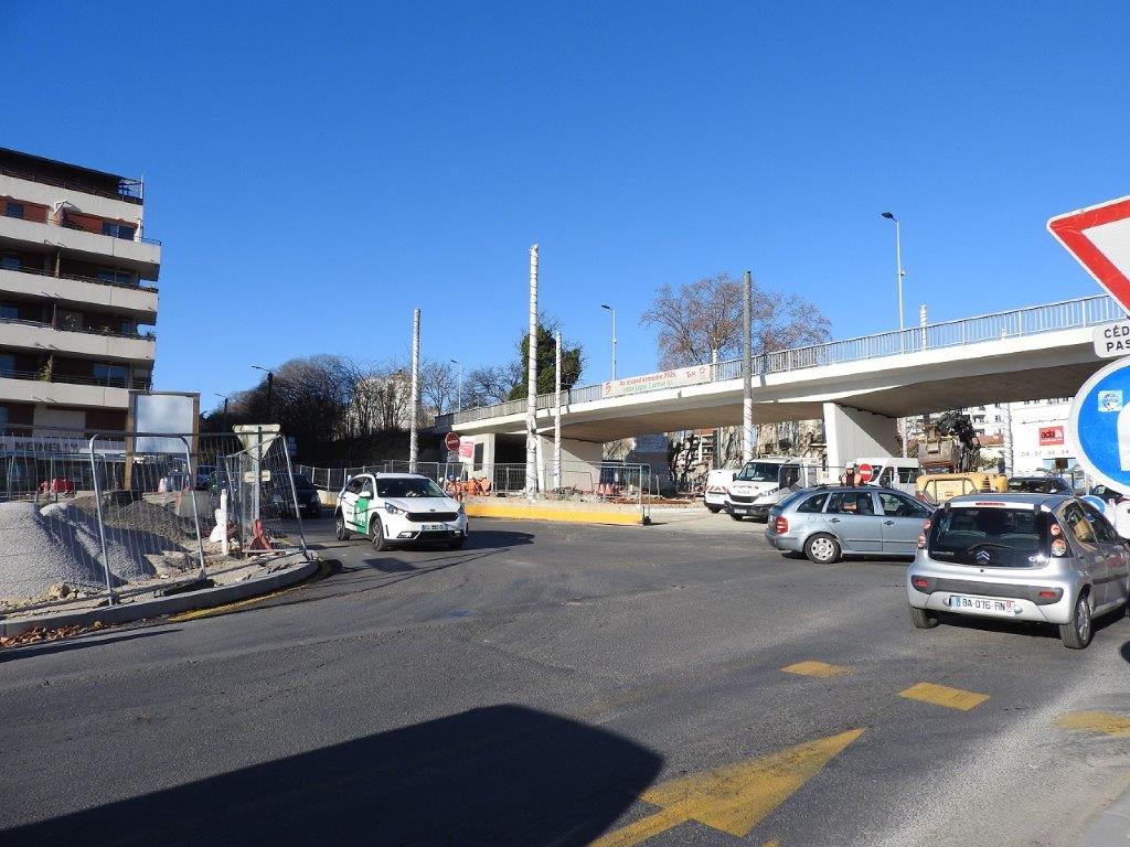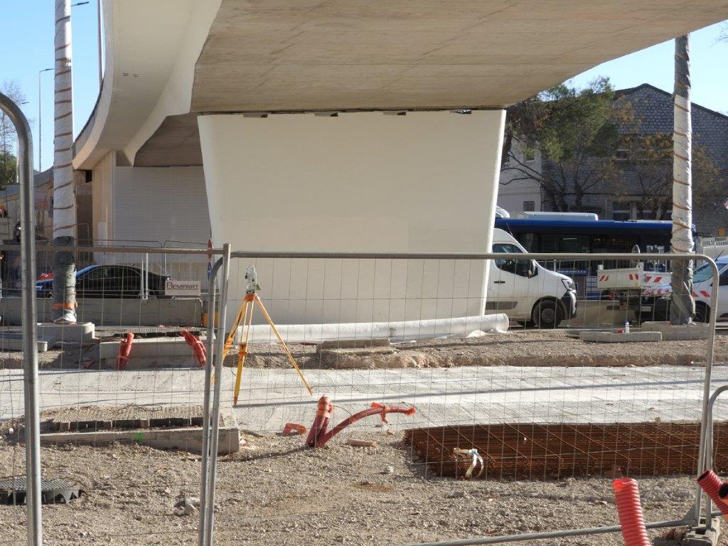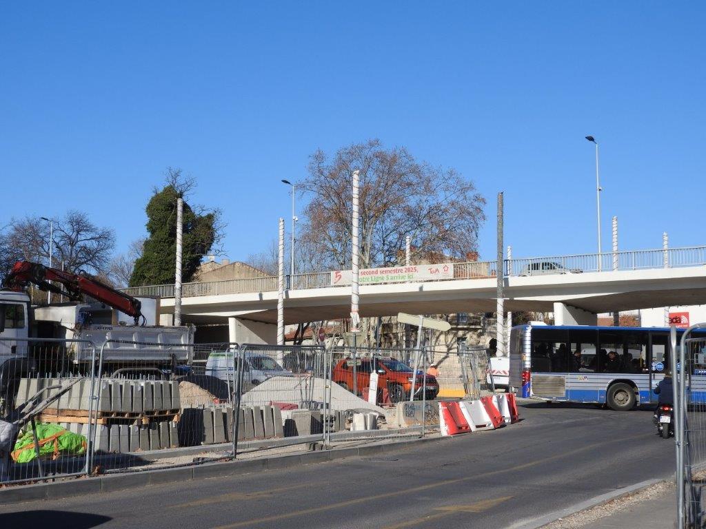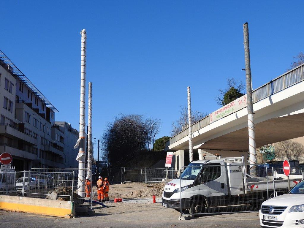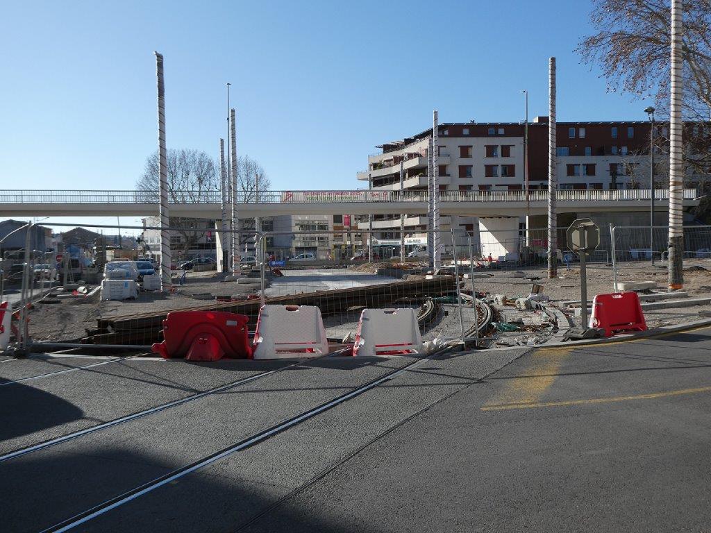 Les mardi 14 et mercredi 15 janvier 2025, des rails à gorge rectilignes ont été posés sur des traverses bibloc en béton entre la double voie ferrée débouchant sur la place du 8-Mai-1945 depuis l’avenue Georges-Clemenceau à l’est et la double voie ferrée venant de l’avenue Lepic à l’ouest et traversant la chaussée où circulent les véhicules automobiles arrivant de la rue de Claret.