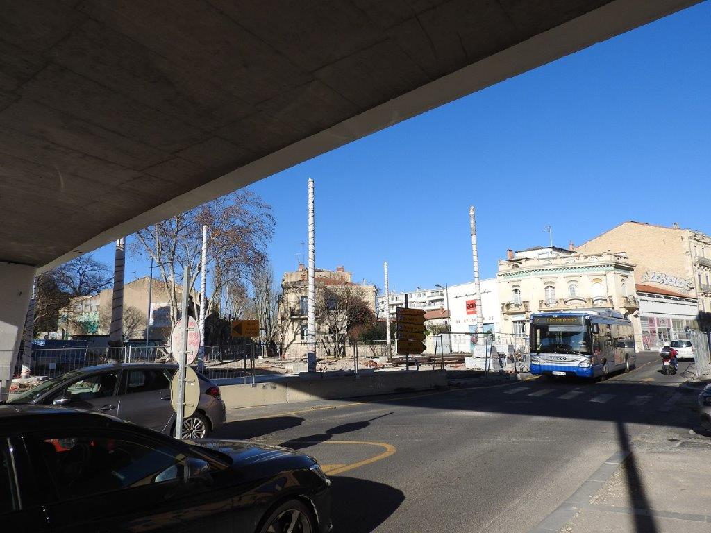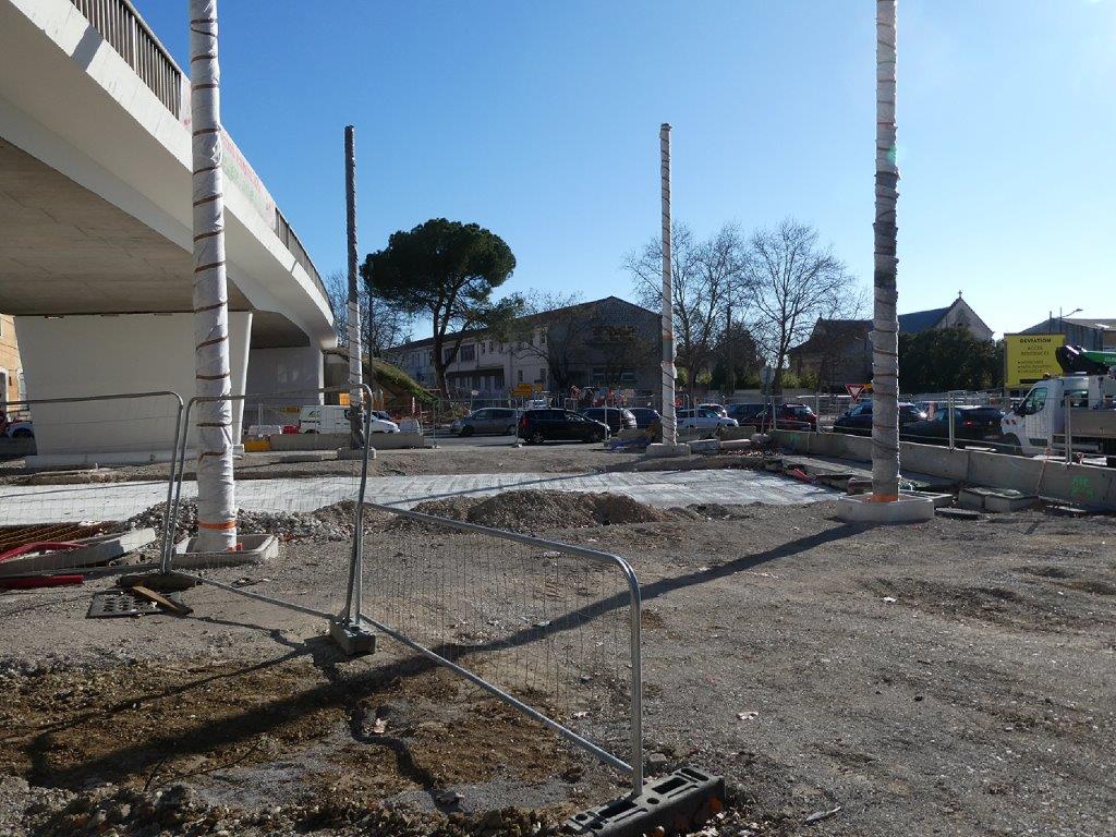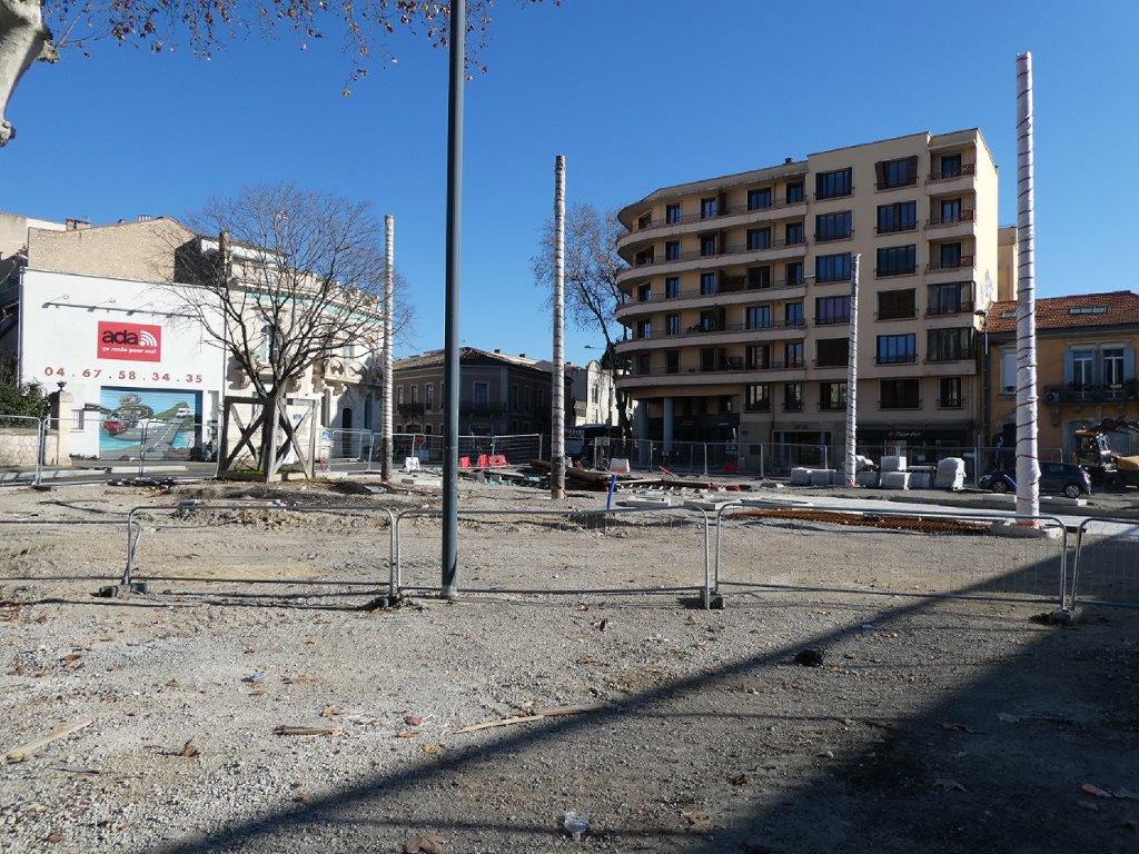 Près de trois ans et demi après l’enlèvement de trente-neuf palmiers, dix mâts supports de câbles devant soutenir les lignes aériennes de contact ont été érigés la semaine dernière sur la place du 8-Mai-1945 à Montpellier où sera implantée la station éponyme qui prendra vie à compter du samedi 20 décembre 2025, date de l’inauguration et de la mise en service de la future ligne 5 de tramway.