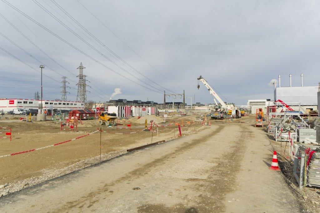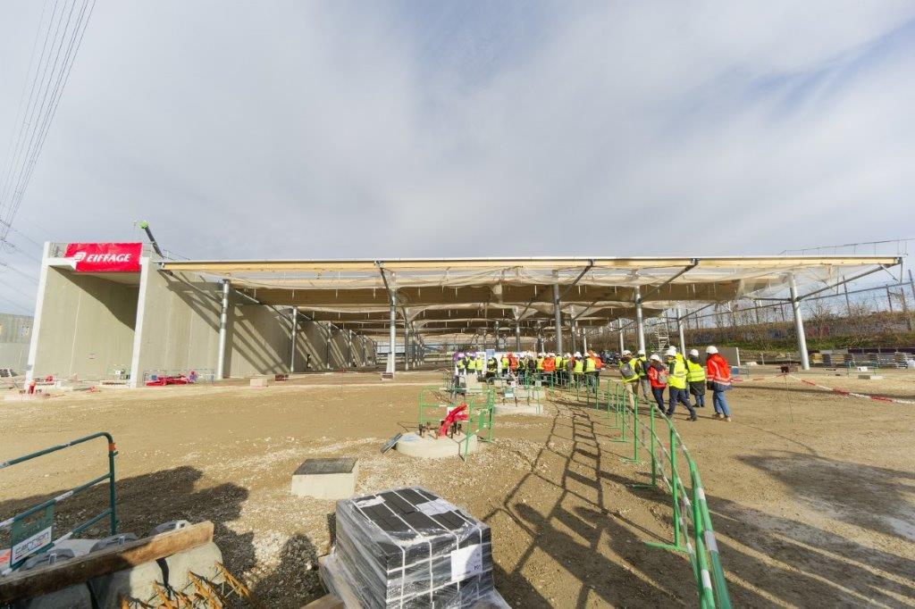 Photographie prise dans l’enceinte de la future unité de transport tramway en cours de construction sur la commune de Saint-Fons, aux portes sud de Lyon, montrant la future zone de remisage des rames abritée par une toiture en bac acier permettant l’installation de panneaux photovoltaïques. Prise de vue en date du vendredi 24 janvier 2025. Copyright : Yvon Brument