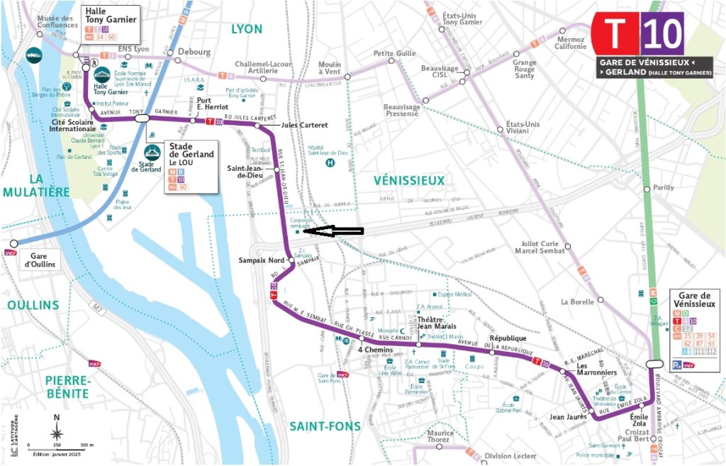 Tracé de la future ligne T10 du réseau de tramways TCL du Grand Lyon. Document : SYTRAL Mobilités – édition janvier 2023 par Latitude-Cartagène SCOP SA. La flèche rajoutée pointe sur l’emplacement du site de la future unité de transport tramway