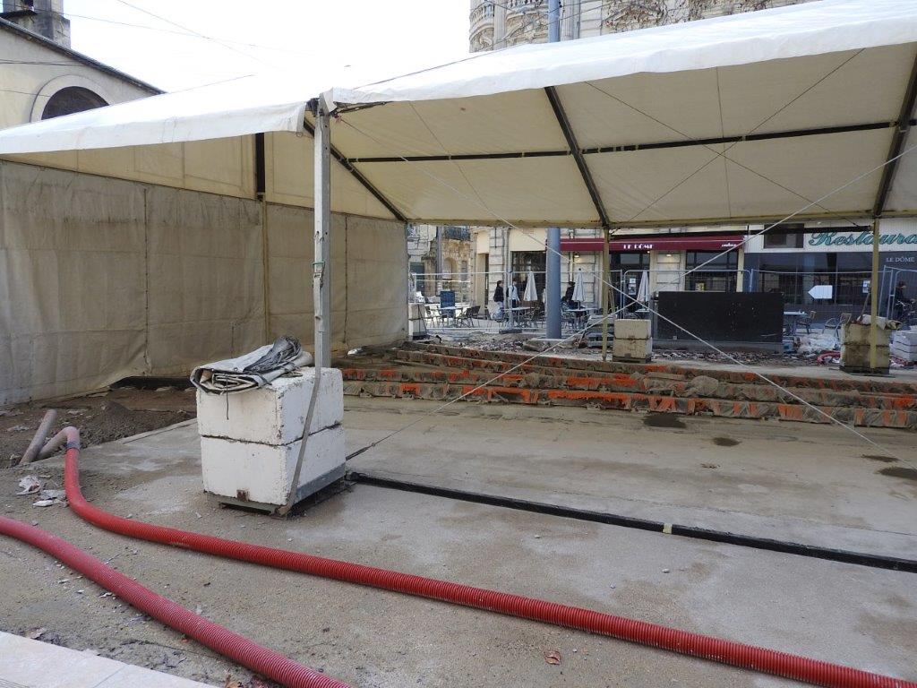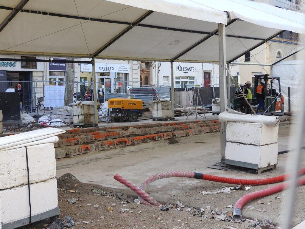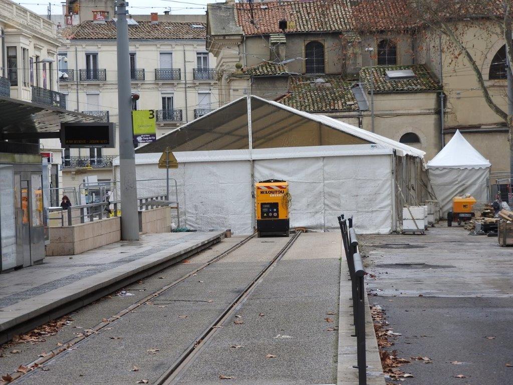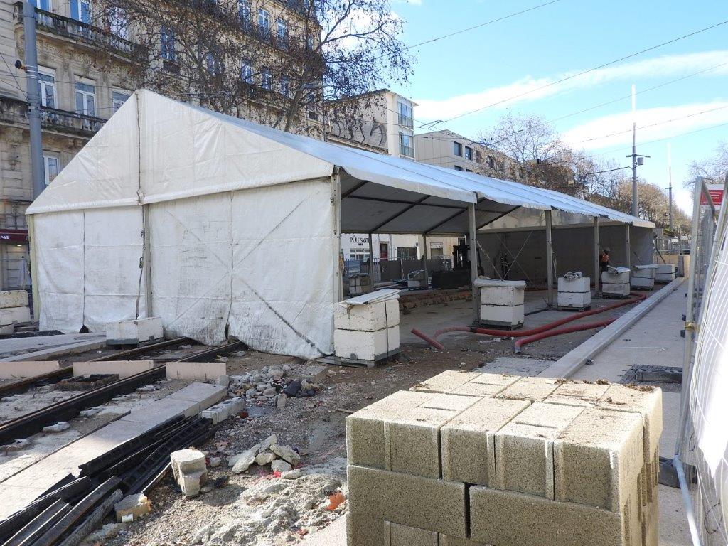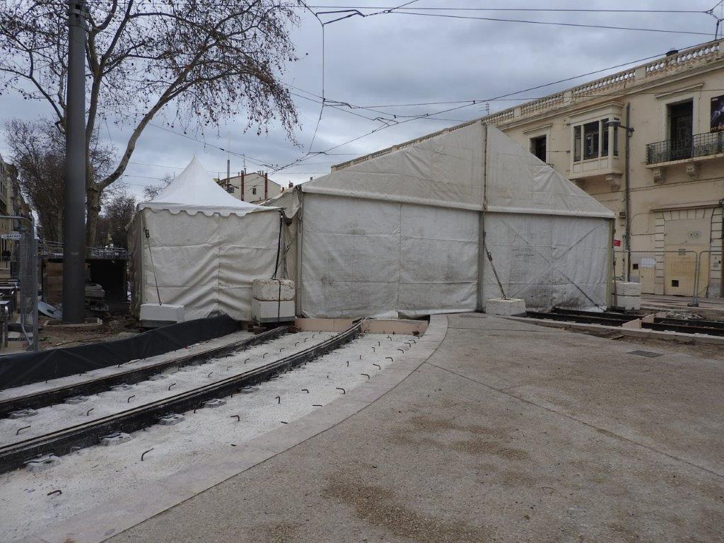 Les médias locaux n’en ont apparemment pas fait état, probablement faute de n’en avoir pas été conviés par le service communication de Montpellier Méditerranée Métropole, mais dans le cadre du raccordement des rails de la ligne 3 à ceux de la future ligne 5 de tramway, à la hauteur de la brasserie « Le Dôme », deux tentes de chantier, une grande et une petite accolées l’une à l’autre, ont été installées pendant une dizaine de jours dans le bas du cours Gambetta à Montpellier, là où une fragilité de la dalle supérieure du parking souterrain Gambetta a été fortuitement découverte l’été dernier, alors que se déroulaient déjà des travaux de raccordement des rails de la ligne 3 à ceux de la future ligne 5.