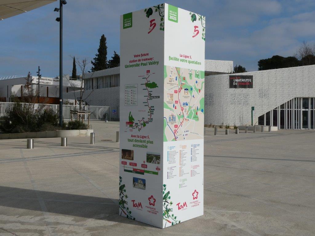 Avenue du Docteur Pezet à Montpellier, photographie d’une affiche annonçant la mise en service de la future ligne 5 de tramway, placée dans un panneau vitré faisant partie du mobilier de la future station « Saint-Eloi – Docteur Pezet » propre à cette nouvelle infrastructure de transport public. Prise de vue en date du dimanche 16 février 2025. Copyright : Edouard Paris