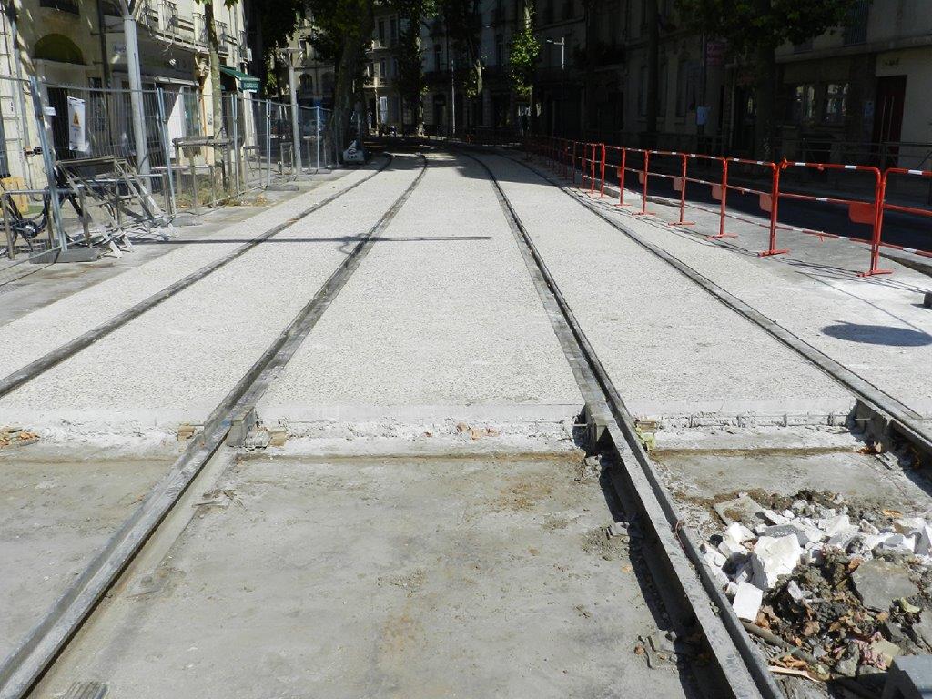 Aperçu du nouveau revêtement en béton désactivé de la plateforme commune aux lignes 1 et 4 de tramway, boulevard Louis-Blanc à Montpellier, le dimanche 26 juillet 2020. Copyright : Anje34