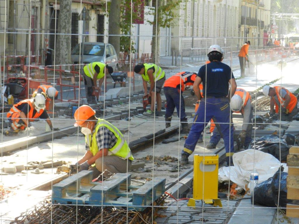 Au bout du boulevard Pasteur, côté place Albert-1er à Montpellier, préparation de la plateforme commune aux lignes 1 et 4 de tramway en vue d’un prochain coulage de béton désactivé. Photographie prise le mercredi 5 août 2020. Copyright : Anje34
