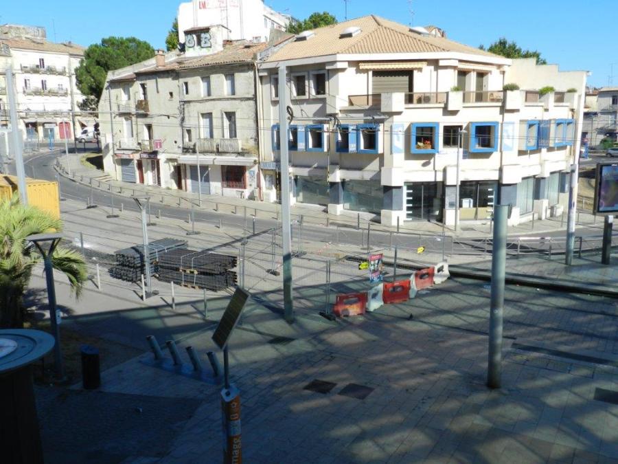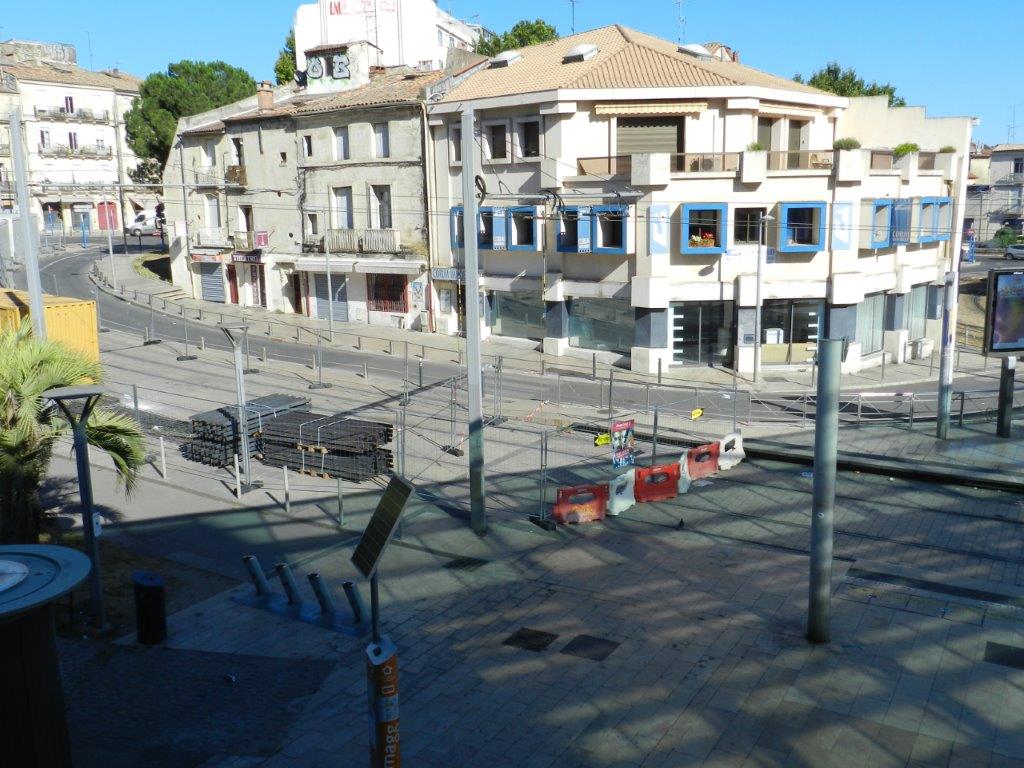 Rue du Faubourg-de-Nîmes à Montpellier, stockage de matériaux devant être utilisés dans le cadre des travaux de réfection du revêtement de la plateforme commune aux lignes 1 et 4, boulevards Louis-Blanc et Pasteur, cet été 2020. Photo prise le dimanche 12 juillet 2020. Copyright : Anje34