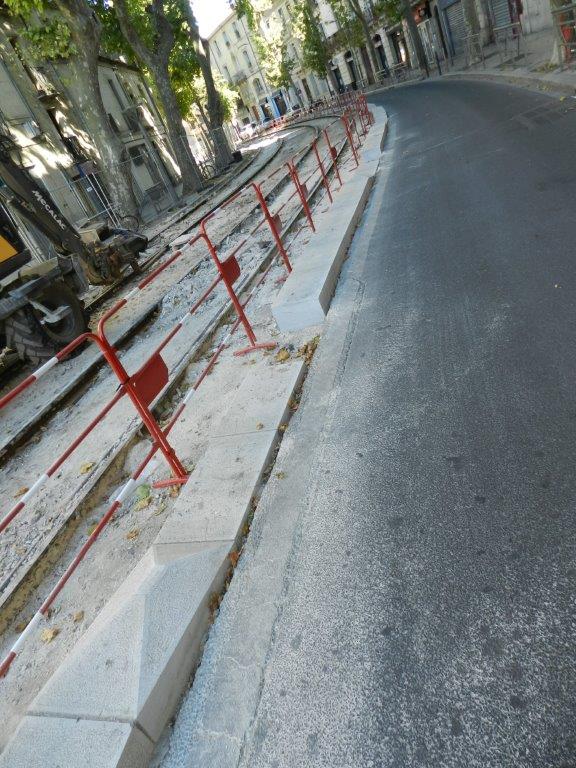 Boulevard Louis-Blanc à Montpellier, le revêtement de la plateforme commune aux lignes 1 et 4 de tramway va faire peau neuve. Photo prise le dimanche 12 juillet 2020. Copyright : Anje34