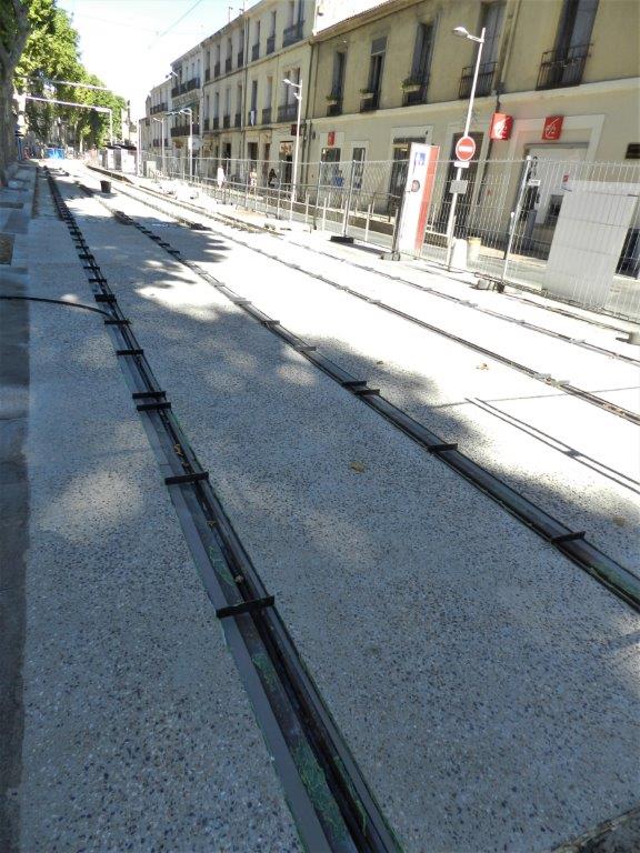 Boulevard Louis-Blanc à Montpellier, à la hauteur de l’agence de la Caisse d’Epargne, le nouveau revêtement de la plateforme commune aux lignes 1 et 4 de tramway est constitué de béton désactivé. Photo prise le dimanche 12 juillet 2020. Copyright : Anje34