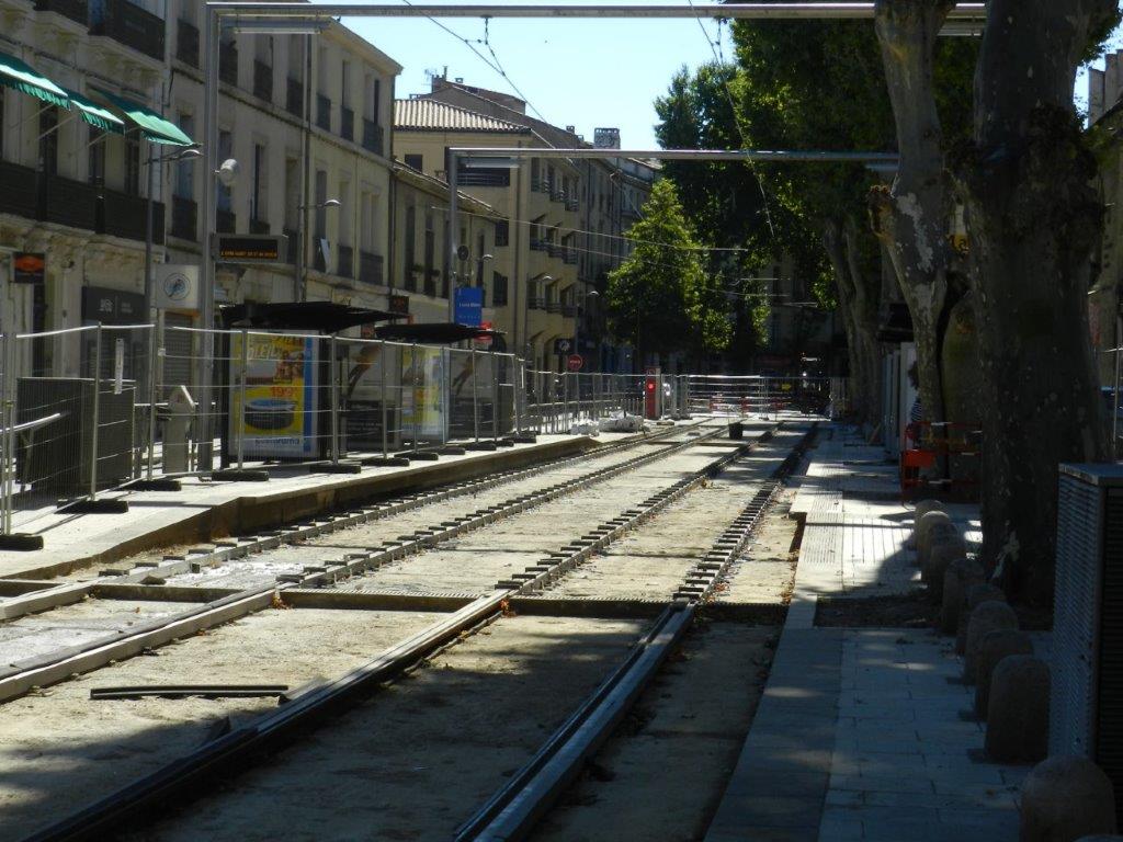 Avancement des travaux d’été sur le tronc commun des lignes 1 et 4 de tramway à la hauteur de la station « Louis Blanc », le dimanche 12 juillet 2020. Copyright : Anje34