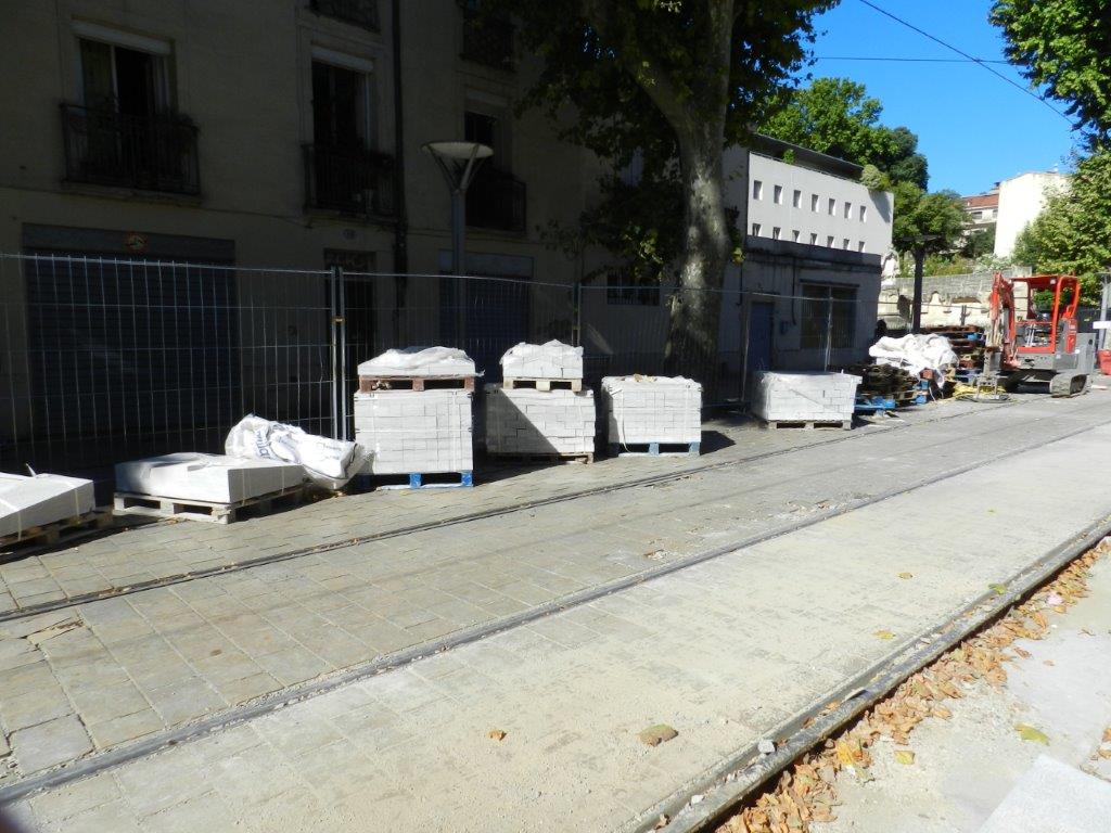 Boulevard Pasteur à Montpellier, stockage de bordures et de pavés sur la plateforme commune aux lignes 1 et 4 de tramway dont le revêtement d’origine va disparaître prochainement. Photo prise le dimanche 12 juillet 2020. Copyright : Anje34