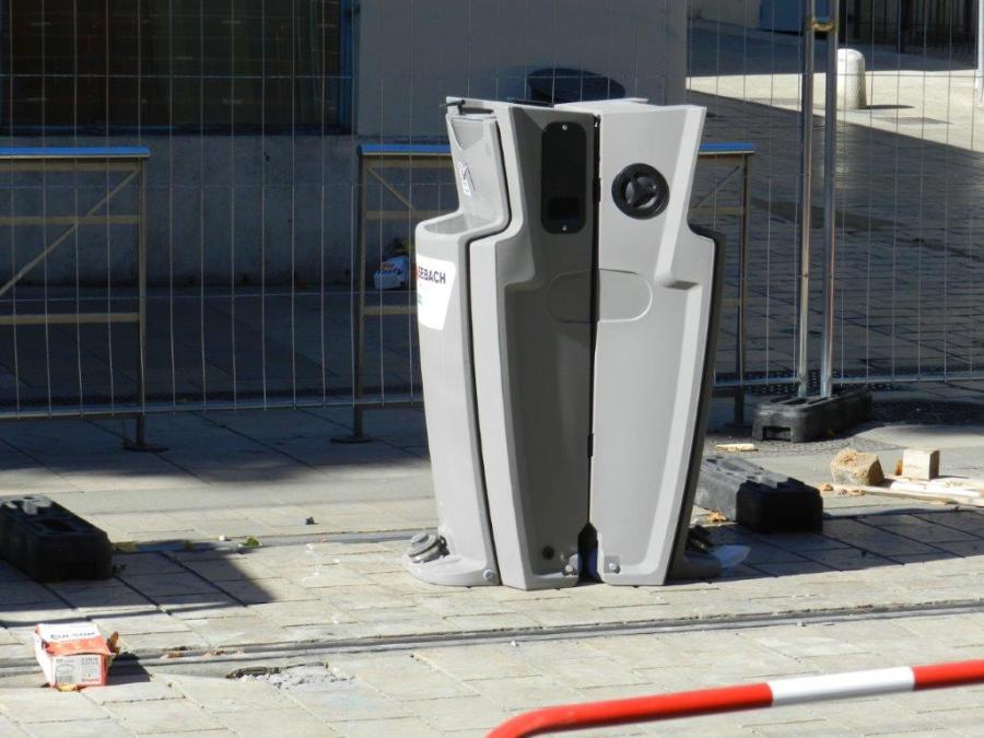 Boulevard Pasteur à Montpellier, photographie d’un double lave-main portatif destiné aux personnes travaillant sur le chantier de réfection du revêtement de la plateforme commune aux lignes 1 et 4 de tramway, le dimanche 12 juillet 2020. Copyright : Anje34