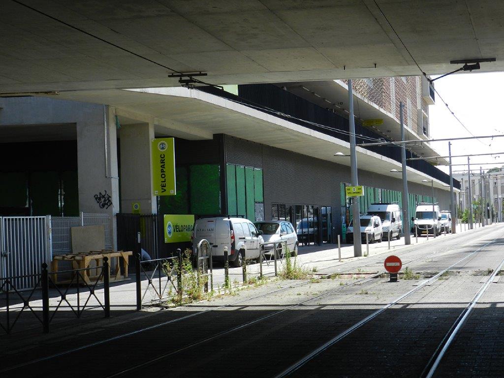 Rue Alexandra David-Néel à Montpellier, le lundi 29 juin 2020, photographie des véhicules des corps de métier intervanant dans les locaux de la nouvelle salle de sport Basic-Fit dont les parois vitrées donnant sur l’extérieur avaient été peintes en vert au cours de la seconde quinzaine du mois de janvier 2020 par l’artiste Stéphan Barron, l’œuvre ayant été baptisée ON/Green. Copyright : Anje34